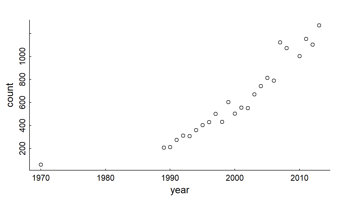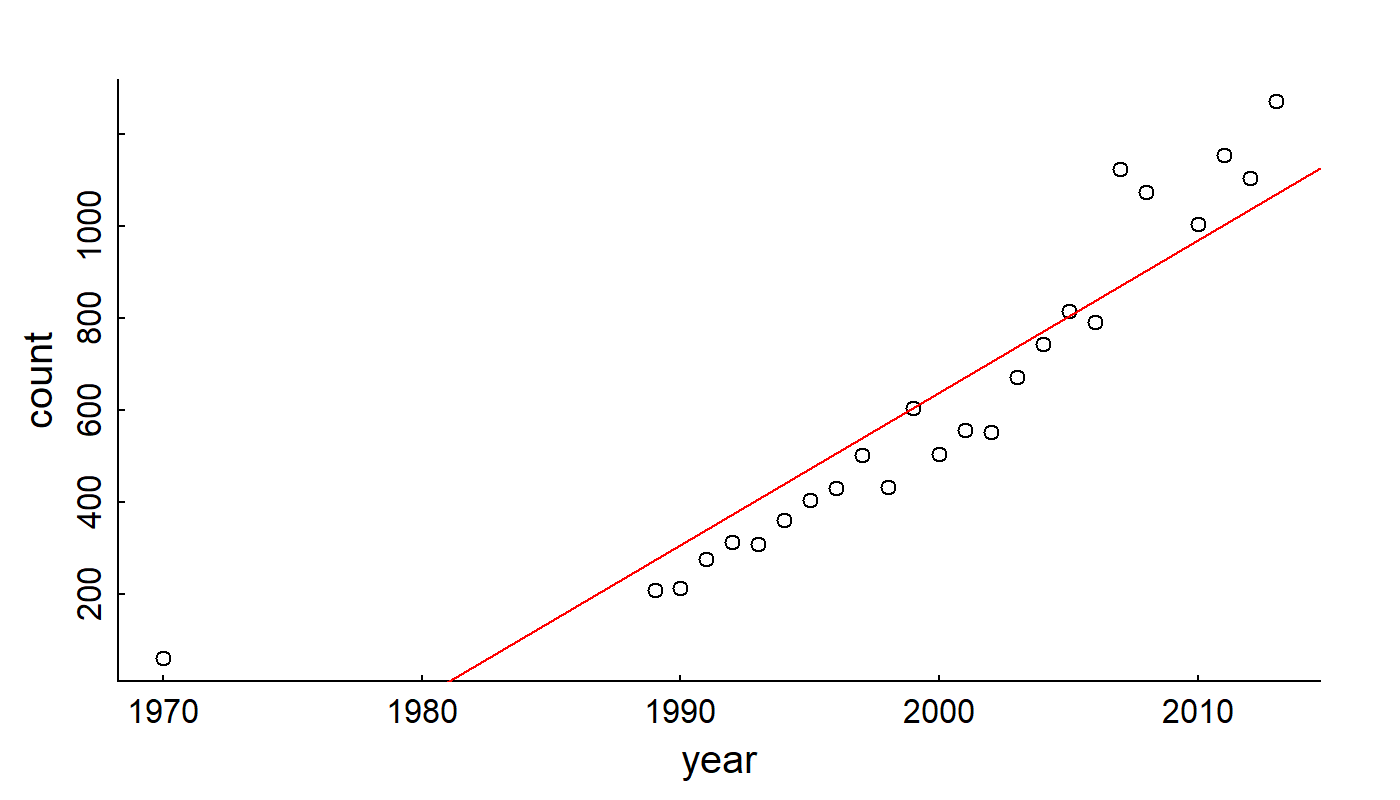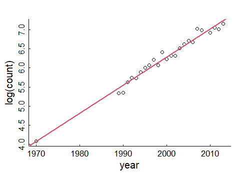 ] --- ## **Steller sea lion** (*Eumatopias jubatus*) - birth .center[ <iframe src="https://drive.google.com/file/d/1BP1FS4736pwUWYtNzSFT-tDlMgPdTi9u/preview" width="720" height="480" frameborder="0" allow="autoplay; fullscreen" allowfullscreen> </iframe> ] --- # Linear modeling .small[(aka ***REGRESSION***, except I really don't like that term, for a variety of reasons to discuss in class.)] is a very general method to quantifying relationships among variables. .pull-left-60[ <img src="ExponentialGrowth_PartII_linearmodels_files/figure-html/SeaLionPlots-1.png" alt="" width="80%" /> ] .pull-right-30[  ] --- ## Linear Models .pull-left[ **Deterministic:** `$$Y_i = a + bX_i$$` `\(a\)` - intercept; `\(b\)` - slope <!-- --> ] .pull-right[ **Statistical:** `$$Y_i = \alpha + \beta X_i + \epsilon_i$$` `\(\alpha\)` - intercept; `\(\beta\)` - slope; `\(\epsilon\)` - **randomness!** `$$\epsilon_i \sim {\cal N}(0, \sigma)$$` <!-- --> ] --- .pull-left[ # Fitting models is easy in ! **Point Estimate** This command fits a model: .small[ ``` r lm(Weight ~ Length, data = pups) ``` ``` ## ## Call: ## lm(formula = Weight ~ Length, data = pups) ## ## Coefficients: ## (Intercept) Length ## -49.1422 0.7535 ``` ] So for **each 1 cm** of length, add another **754 grams**. ] .pull-right[ ``` r plot(Weight ~ Length, data = pups) abline(my_model) ``` <!-- --> The `abline` puts a line, with intercept `a` and slope `b` onto a figure. ] --- ## Some comments on linear models .pull-left[ $$ Y_i \sim \alpha + \beta X_i + \epsilon_i$$ 1. <font color = "red"> `\(\huge \epsilon_i\)` </font> is .darkblue[**unexplained variation**] or .darkblue[**residual variance**]. It is often (*erroneously*, IMO) referred to as .red["**error**"]. It is a **random variable**, NOT a **parameter** or **data**. 3. <font color = "red"> `\(\huge \alpha+\beta X_i\)` </font> is the .darkblue[**predictor**], or the .darkblue[**"modeled"**] portion. There can be any number of variables in the **predictor** and they can have different powers, so: `$$Y_i \sim {\cal N}(\alpha + \beta X_i + \gamma Z_i + \delta X_i^2 + \nu X_i Z_i, \sigma )$$` is also a **linear** model. <!-- 2. A **better**, more sophisticated way to think of this model is not to focus on isolating the residual variance, but that the whole process is a random variable: `$$Y_i \sim {\cal N}(\alpha + \beta X_i, \sigma)$$` This is better because: (a) the three parameters (`\(\alpha, \beta, \sigma\)`) are more clearly visible, (b) it can be "generalized". For example the **Normal distribution** can be a **Bernoulli distribution** (for binary data), or a **Poisson distribution** for count data, etc. --> ] .pull-right[ <!-- --> ] --- .pull-left-60[ # Statistical inference **Statistical inference** is the *science / art* of observings *something* from a **portion of a population** and making statements about the **entire population**. In practice - this is done by taking **data** and **estimating parameters** of a **model**. (This is also called *fitting* a model). Two related goals: 1. obtaining a **point estimate** and a **confidence interval** (precision) of the parameter estimate. 2. Assessing whether particular (combinations of) factors, i.e. **models**, provide any **explanatory power**. This is (almost always) done using **Maximum Likelihood Estimation**, i.e. an algorithm searches through possible values of the parameters that make the model **MOST LIKELY** (have the highest probability) given the data. ] .pull-right-40[  .small[Another gratuitous sea lion picture.] ] --- .pull-left-60[ ## Statistical output <font size="4"><pre> ``` ## ## Call: ## lm(formula = Weight ~ Length, data = pups %>% subset(Island == ## "Raykoke")) ## ## Residuals: ## Min 1Q Median 3Q Max ## -7.498 -1.718 0.023 1.764 7.276 ## ## Coefficients: ## Estimate Std. Error t value Pr(>|t|) ## (Intercept) -49.14222 5.75796 -8.535 1.81e-13 *** ## Length 0.75345 0.05193 14.510 < 2e-16 *** ## --- ## Signif. codes: 0 '***' 0.001 '**' 0.01 '*' 0.05 '.' 0.1 ' ' 1 ## ## Residual standard error: 2.761 on 98 degrees of freedom ## Multiple R-squared: 0.6824, Adjusted R-squared: 0.6791 ## F-statistic: 210.5 on 1 and 98 DF, p-value: < 2.2e-16 ``` </pre></font> ] -- .pull-right-40[ ### 1. Point estimates and confidence intervals .red.center[ **Intercept** ( `\(\alpha\)` ): `\(-49.14 \pm 11.5\)` **Slope** ( `\(\beta\)` ): `\(0.75 \pm 0.104\)` ] ### 2. Is the model a good one? *p*-values are very very small, in particular for **slope** Proportion of variance explained is high: .blue.large[$$R^2 = 0.68$$] ] --- .pull-left-60[ ## Statistical output <font size="4"><pre> ``` ## ## Call: ## lm(formula = Weight ~ Length, data = pups %>% subset(Island == ## "Raykoke")) ## ## Residuals: ## Min 1Q Median 3Q Max ## -7.498 -1.718 0.023 1.764 7.276 ## ## Coefficients: ## Estimate Std. Error t value Pr(>|t|) ## (Intercept) -49.14222 5.75796 -8.535 1.81e-13 *** ## Length 0.75345 0.05193 14.510 < 2e-16 *** ## --- ## Signif. codes: 0 '***' 0.001 '**' 0.01 '*' 0.05 '.' 0.1 ' ' 1 ## ## Residual standard error: 2.761 on 98 degrees of freedom ## Multiple R-squared: 0.6824, Adjusted R-squared: 0.6791 ## F-statistic: 210.5 on 1 and 98 DF, p-value: < 2.2e-16 ``` </pre></font> ] .pull-right-40[ ### Interpreting statistical results The "standard error" around the **Length** factor is 0.05. The "true value" lies within **TWO** standard errors of the **point estimate** with 95% probability. So the estimate of the slope with **confidence interval** is (in g/cm): `\(\widehat{\beta} = 754 \,g/cm \pm 104\)` The `\(p\)`-value around the **Length** factor is `\(<2 \times 10^{-16}\)` .. i.e. **0** This says that there is NO chance that you would get this steep a slope if there were NO relationship between Length and Weight (the null hypothesis). So we've performed both **estimation** and **hypothesis testing** with this model. ] --- ### Models and Hypotheses > .large[**Every *p*-value is a Hypothesis test.**] .center[ <table class="table" style="color: black; margi