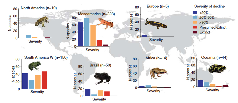 ] .subtitle[ ## EFB 390: Wildlife Ecology and Management ] .author[ ### Dr. Elie Gurarie ] .date[ ### November 7, 2024 ] --- <!-- https://bookdown.org/yihui/rmarkdown/xaringan-format.html --> .pull-left-60[ ## First, some slides on Body Condition **Fecundity** and **Survival** both depend very much on **body condition**. **Body condition** is measured in many ways, for example:. > .small[ We analysed two metrics of body condition: i) a direct subcutaneous **fat score (categorical, 1-5)**, assessed by palpating the belly-loin, with the badger laterally recumbent, and ii) a **body condition index (BCI)** estimated using a ratio-based approach for each capture: log (body mass)/log (body length). ] European badger (*Meles meles*): .pull-right-50[] ] .pull-right-40[ <br><br>  .center[[(Ross et al. 2021)](https://www.sciencedirect.com/science/article/pii/S2666900521000228)] ] --- ## Remote assessments of body condition .pull-left-30[ Field measurements made using categorical assessments. ] .pull-right-70[] --- .pull-left-30[ ## Other measurements #### Note invasive measures Kidney fat - healthy mammals Bone marrow fat - informative for non-healthy mammals ] .pull-right-70[ .center[([Sanchez et al. 2018](https://onlinelibrary.wiley.com/doi/epdf/10.1111/ele.13160))] ] --- # Considerations of measuring body condition .pull-left-40[ Short- and long-term effects of a stressor all need to be considered, and are measured differently (and have different consequences).  .center[***Any idea what this is!?***] ] .pull-right-60[] --- .pull-left[ ## Influences on body condition - **Food availability** - including (often) high seasonal variation - These relationships make **Body Condition** a good proxy for **Habitat Quality** - **Disease and parasite loads** - **Stress** - from human, predator impacts, or social interactions ] .pull-right[ ## Consequences of (poor) body condition - Lower **survival** & lower **fecundity** - Varies by age - Often - physiological energetic trade-offs between **survival** and **reproduction** (less gonadal growth, later maturation, skipped estrus) - Population level impacts - mechanisms of **Density Dependence** ] --- background-image: url("images/Chytridiomycosis.jpg") background-size: cover class:inverse #Back to Wildlife Disease --- .pull-left[ ## Why do we care? .large[ They affect humans - **Wildlife** <-> **Human** transmission They affect animals - Population = Birth + Immigration - Emigration - **DEATH** **Pathogens** are also part of the ecosystem! ]] -- .pull-right[ ## Disease Ecology is super interesting! .large[ .pull-left[ - Ecology - Behavior - Medicine - Evolution - Genetics - Immunology - Epidemiology - Modeling - Trophic Interactions ] .pull-right[ - Hosts - Intermediate hosts - Pathogens - Predator-mediation - Biotic/abiotic environments - Climate Change ]]] --- <iframe src="https://www.youtube.com/embed/o5ECFLG2EwI?controls=0" width="900" height="600" frameborder="0" allowfullscreen> </iframe> <!-- https://www.youtube.com/watch?v=59STc4gg4wI&ab_channel=WyomingGameandFishDepartment--> --- class: large ## Some Definitions ### **Pathogen:** infectious biological agent that causes disease or illness to its host #### .large[Bacteria | Viruses | Fungi | Other] ### **Vector:** a host that can transmit but is not itself affected by a pathogen ### **Zoonotic Disease:** a human disease of wildlife origin ### **Natural Reservoir:** population of organisms or specific environment in which an infectious pathogen lives and reproduces ### **Infectivity:** ability of a pathogen to establish an infection. ### **Virulence / Pathogenicity:** (severe or fatal cases) / (total cases) --- background-image: url("images/rabid_dog.webp") background-size: cover # .yellow[**Zoonotic diseases**] ### .yellow[(because they affect humans)] -- .pull-left[] --- ## Zoonotic diseases .pull-left-40[ **Emerging infectious diseases per decade**  ] .pull-right-60[ 60% of EID are caused by zoonotic pathogens. 72% of zoonotic EID origins in **wildlife** (vs. domesticated) origin.  **Note prominence of NE. US!** ([Jones et al. 2008](https://www.nature.com/articles/nature06536)) ] --- .pull-left-40[ ## Example: **Rabies**  .small[http://europepmc.org/article/PMC/6899062] ] .pull-right[ <br> **Rabies** is an *encephalitis* (brain inflammation) for *most* mammals. Spread by *Lyssavirus* (family of viruses) spread through saliva. The disease (cleverly!) modifies behavior to make spread via saliva more likely: - aggressiveness leading to biting. - excrutiating pain when swallowing / hydrophobia, Largely **asymptomatic** bat *reservoir*, leaks into spillover infections to, esp., domestic dogs & humans. **Effective vaccines exist!!** (in fact, developed by Louis Pasteur in 1885) ] --- .center[## Rabies vectors] .pull-left[ In the US (**where rabies is very very rare**) - almost all carriers are wild animals. Variants are (usually) species-specific. Wild animal vectors depend on local ecology.  .small[ [www.cdc.gov](https://www.cdc.gov/rabies/location/usa/surveillance/wild_animals.html) ] ] .pull-right-50[  ] --- .pull-left[ ## How to manage **Rabies**? - Dog management (stray control / muzzling / vaccination) - Vigilance - Removal of infected animals - Vaccination! (trap / release or oral)  ] -- .pull-right[  ### Including the wild ones ] --- .pull-left-60[ ## Example: **Lyme Disease**  .small[Nature.com] ] .pull-right-40[ ### Most prevalent vector-borne disease in N. America **Pathogen:** *Borrelia burgedorferi* (bacteria) Transmitted by *Ixodes* ticks, via complicated, multi-stage growth (larvae / nymph / adult). **Each stage** must independently pick up the bacteria. Does **not** affect most hosts! Only humans / dogs / some cattle. ~476,000 people / year infected and treated in US. ] ??? Uninfected larvae hatch and seek a host to feed on, which is typically a small mammal or bird, but may include larger animals. Because *Borrelia burgdorferi* is not transmitted transovarially, this life stage is the pri