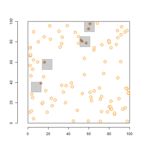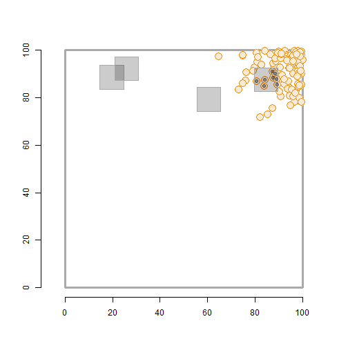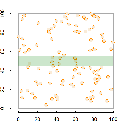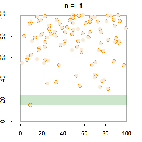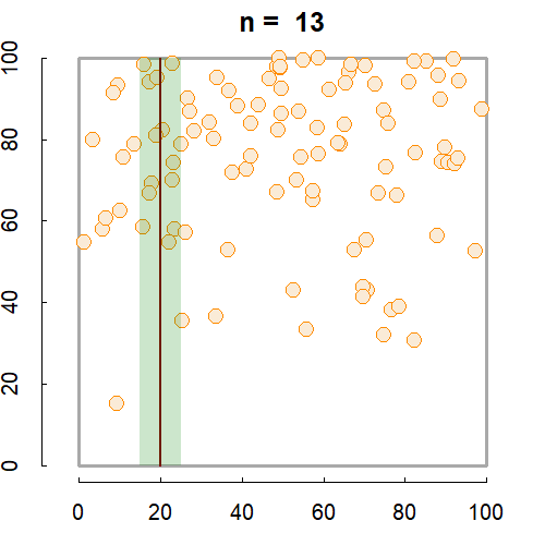 class: left, title-slide .title[ # .white[Counting Animals Part II: Sample Counts] ] .subtitle[ ## .white[EFB 390: Wildlife Ecology and Management] ] .author[ ### .white[Dr. Elie Gurarie] ] .date[ ### .white[September 11, 2025] ] --- <!-- https://bookdown.org/yihui/rmarkdown/xaringan-format.html --> ## Drawbacks of total counts / censusing .pull-left-60.large[ Expensive & labor-time intensive Impractical for MOST species / systems - need to ALL be **visible** - the **ENTIRE** study area needs to be survey-able Hard to assess precision ] .pull-right-40[  .center[**Hippos**] .small.grey[(Marc Mol/Mercury Press/Caters)] ] --- ### Is the great Elephant Census a Census? <iframe src="https://www.youtube.com/embed/imvehfydUpc?controls=0" width="900px" height="500px"> </iframe> --- class: inverse # Sample counts ### Simple idea: - count *some* of the individuals - extrapolate! -- ### In practice: - Necessarily - less **precise** due to **sampling error**. - BUT, if properly done, more **accurate** and **much less effort**. - Involves some (tricky) *statistics* and *modeling!* ### By Necessity: **Very Common** --- ## A random population .pull-left-60[  ] -- .pull-right-40[ ### Population density .large[$$N = A \times D$$] - `\(N\)` - total count - `\(A\)` - total area - `\(D\)` - overall density ] .red[***Which of these do we know?***] --- ## Sampling from the population .pull-left-60[  .center[**Squares**, aka, **quadrats**] ] -- .pull-right-40[ ### *Sample* density: `$$n_{sample} = \sum_{i=1}^k n_i$$` `$$a_{sample} = \sum_{i=1} a_i$$` `$$d_{sample} = {n_{sample} \over a_{sample}}$$` ] --- ### Sample vs. Population | Population | Sample --|:--:|:-- size | `\(N\)` | `\(n_s\)` area | `\(A\)` | `\(a_s\)` density | `\(D\)` | `\(d_s\)` "sample density" `\(d_s\)` is an *estimate* (guess) of total density: `$$\widehat{D} = d_s$$` -- ### True population: .green.large[$$N = A \times D$$] Population **estimate** (best guess for `\(N\)`): just replace true (unknown) density `\(D\)` with *sampling estimate* of density `\(d_s\)`: .red.large[$$\widehat{N} = A \times \widehat{D} = A \times d_s = A \times {n_s \over a_s}$$] --- .pull-left[ ## Example  ] ### Data .blue[10 quadrats; 10x10 km each] .blue[ `n = {0,0,5,0,3,1,2,3,6,1}`] .red[**note:** *variability / randomness!*] -- .pull-right[ ### Analysis .green[ `\(n_s = \sum n_i = 21\)` `\(d_s = \widehat{D} = {21 \over 10 \times 10 \times 10} = 0.021\)` `\(A = 100 \times 100\)` ] ] -- #### final estimate: .Large.green[ `$$\widehat{N} = \widehat{D} \times A = 100\times100\times0.021 = \textbf{210}$$`] --- ## What happens when we do this many times? .pull-left[  ] .pull-right[ Every time you do this, you get a different value for `\(\widehat{N}\)`.  ] --- ### Statistics .pull-left-60[ **Mean of estimates:** `$$\widehat{N} = 301.5$$` **S.D. of estimate:** `$$s_{\widehat{N}} = 54.6$$` .red[**standard error** (***SE***) = *standard deviation* of an *estimate*] **95% Confidence Interval:** `$$\widehat{N} \pm 1.96 \times SE = \{195-408\}$$` ] .pull-right-40[  ] .green[**note:** the 1.96 (basically 2) is the number of standard deviations [on either side] that captures 95% of a normal distribution.] -- Conclusion: this estimate is **accurate** (unbiased), but not very **precise** (big confidence interval). --- ## Estimating **precision** of the estimate **v. 1** **IF:** Total area covered is small: `\(a_s \ll A\)` (.green[.small[*Fryxell says < 15% coverage*]]) **OR: ** You are potentially resampling the same individuals (.green[.small[***Sampling With Replacement*** [SWR]]]) **And: ** samples are .blue[*distributed throughout the range*] - (.green.small[a BIG assumption to revisit!]) **Then:** -- .darkred[$$SE(\widehat{N}) = {A \over a} {\sqrt{\sum n_i} \over k}$$] - `\(n_i\)` is set of **sample counts** - `\(k\)` is the **number of samples**: `\(i =\{1,2,...,k\}\)` ) - `\(a\)` is the area of the sample frame - `\(A\)` is the total area --- ## In our example .Large.darkred[$$SE(\widehat{N}) = {A \over a} {\sqrt{\sum n_i} \over k}$$] - `\(n_i\)` is set of **sample counts** - `\(k\)` is the **number of samples**: `\(i =\{1,2,...,k\}\)` ) - `\(a\)` is the area of the sample frame raw counts: `n = {0,0,5,0,3,1,2,3,6,1}` -- .pull-left[ quantity | value ---|--- a | 10 A | 100² k | 10 `\(\sum n\)` | 21 ] -- .pull-right.darkred[ `$$\begin{align} SE &= 100² \times {\sqrt{21} \over 100 \times 10}\\ &= {\huge 54.8} \end{align}$$` ] --- ## Estimating **precision** of the estimate **v. 2** **IF:** Total area covered is small: `\(a_s \ll A\)` **OR:** You might be resampling the same individuals (.green[.small[***Sampling With Replacement*** [SWR]]]) **And:** .blue[*you don't know how they are distributed throughout the range*] - (.green.small[this is a MUCH BETTER assumption]) **Then:** -- `$$SE(\widehat{N}) = {A \over ka} \sqrt{ {\sum n_i^2 - (\sum n_i)^2/k) \over k(k - 1)}}$$` .center[**Much uglier! But more useful!**] --- ## In our example .Large.darkred[$$SE(\widehat{N}) = A \sqrt{ {\sum n_i^2 - (\sum n_i)^2/k) \over k(k - 1)}}$$] raw counts: `n = {0,0,5,0,3,1,2,3,6,1}` .pull-left-40[ quantity | value ---|--- a | 10 A | 100² k | 10 `\(\sum n^2\)` | 85 `\((\sum n)^2\)` | 441 ] .pull-right-60[ ``` r n = c(0,0,5,0,3,1,2,3,6,1) a <- 10; A <- 100^2; k <- 10 (A/(k*a) * sqrt( (sum(n^2) - (sum(n)^2/k)) / (k*(k-1)) )) ``` ``` ## [1] 67.41249 ``` .large.center.darkred[ `\(SE(\widehat{N}) = 67.4\)` ] ] --- class: inverse ## In-class Experiment #### Some facts - There are .red[**95**] students in this class (+/- 1 !). - Each student has a first name, composed of some number *n* of letters - There are a total of .red[***N***] letters in all the first names of the class. #### The challenge: - break into groups of **8-12** and record the number of letters in the first names of all the people in your group - estimate the total number of letters in the names of the entire class. #### formulae .center.red[ `\(\widehat{N} = A {\sum n \over ak}; \,\,\,\,\, SE(\widehat{N}) = A \sqrt{ {\sum n_i^2 -