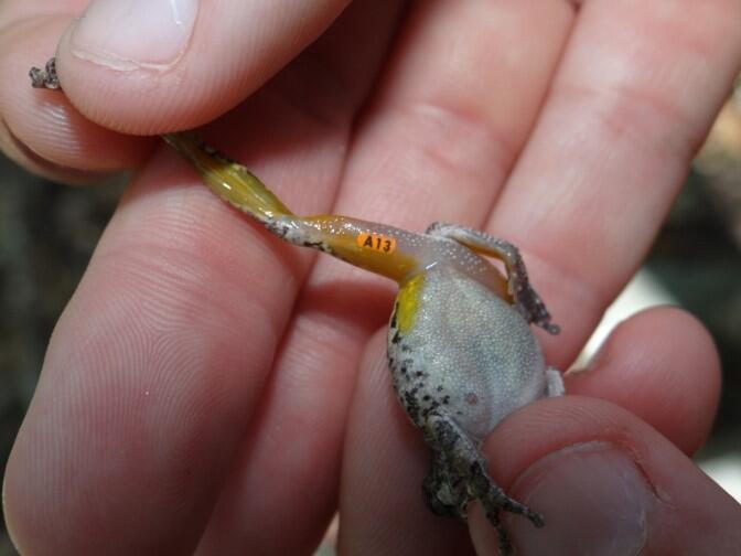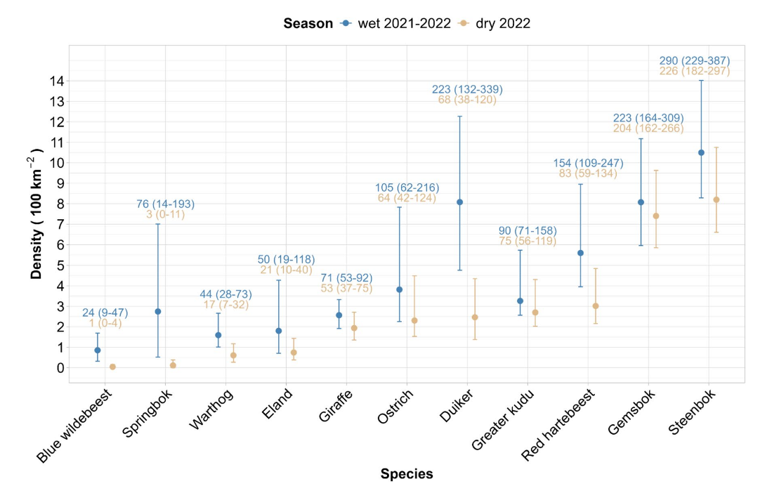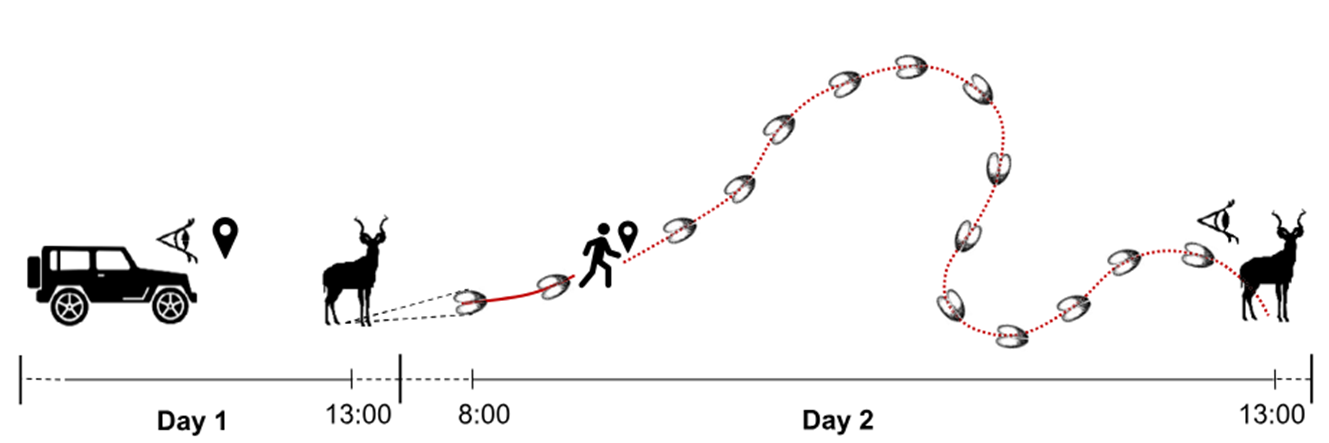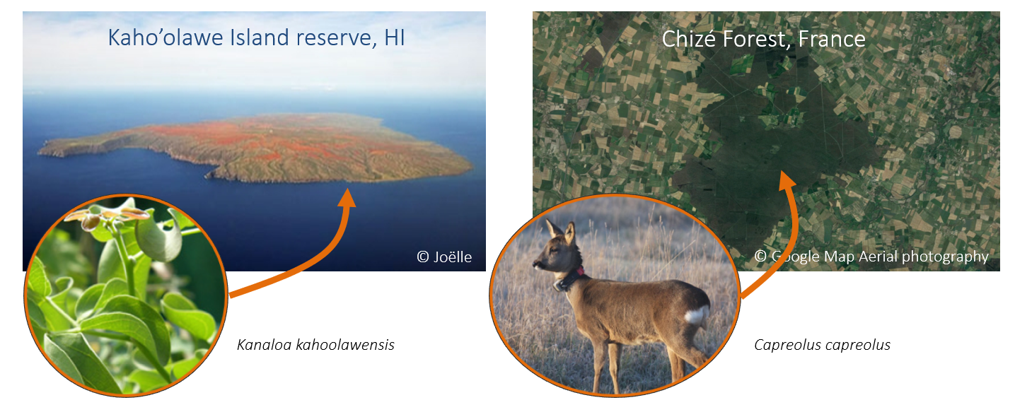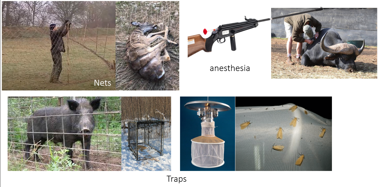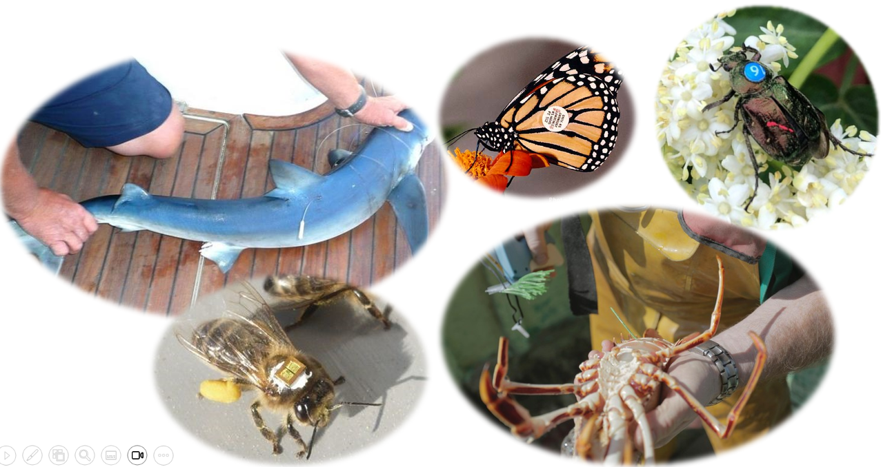 class: top, left, title-slide .title[ # .white[Mark-Recapture and Index Counts] ] .subtitle[ ## .white[EFB 390: Wildlife Ecology and Management] ] .author[ ### .white[Dr. Elie Gurarie] ] .date[ ### .white[September 18, 2025] ] --- class: inverse <!-- https://bookdown.org/yihui/rmarkdown/xaringan-format.html --> ## Mark-Recapture .pull-left[ .large[is a super-versatile, very common tool for: - **Estimating Abundances** (with confidence intervals) ... But also: - Survival - Growth Rate - Reproductive Rates ]] .pull-right[  [USGS Bayou Treefrog Project](https://www.usgs.gov/centers/wetland-and-aquatic-research-center/science/capture-mark-recapture-treefrogs-bayou-teche) ] --- class: inverse ## How!? 1. Capture individuals at time `\(t\)` - In their reproduction area, their wintering area, along their migration route… - using traps, nets, anesthesia, binoculars 2. Mark `\(M\)` individuals - Using paint, ring, tag, collar, chip, transponder… 3. Release the individuals at the capture site 4. Re-capture `\(C\)` individuals at time `\(t+1\)` - Physically or visually - In the same area of the first capture either the same year or the next one 5. Count the marked individuals `\(R\)` in the new subset --- ## Mark-Recapture is Super Simple 1. mark random subset, 2. release, 3. recapture, 4. count marked  --- ## Mark-Recapture .squeeze-70[ Basic idea, **ratios should be similar**: `$${marked\,(M) \over total\,(N)} = {recapture\,marked (R) \over recapture\,total (C)}$$` ] --- ## Mark-Recapture .squeeze-70[] .pull-left.center[ Convert that to estimate: `$$\widehat{N} = {𝑀 \times 𝐶\over 𝑅}$$` **Lincoln-Petersen Index** ] -- .pull-right.center[ And there's a formule for SE `$$SE(\widehat{N}) = \sqrt{M^2(C+1)(C-R)\over{(C+1)^2(C+2)}}$$` ] --- ## Challenges: .center.large[Delineating the spatial limits of the ***“population”***] ### Sometimes easy!  --- ## Challenges: .center.large[Delineating the spatial limits of the ***“population”***] ### Sometimes hard! .squeeze-70[] --- ## Challenges: .center.large[Choosing a minimally harmful method of **capture**]  --- ## Challenges: .large[**Best:** (but limited in practice) is **Visual Capture** (and recapture)] .pull-left-40[] .pull-right-60[] --- ## Challenges: .center.large[Choosing a minimally invasive method of **marking**]  --- ## Challenges: .center.large[Choosing a minimally invasive method of **marking**]  --- ## Challenges: .large[**Best:** (but limited in practice) is **Visual Capture** (and recapture)]  --- class: inverse ## I banded students! .pull-left-50[  ] .pull-right-50.center[ ... by going back in time and subtly manipulating your parents so that exactly .Large.red[**M<sub>t</sub> = 27**] of you have the letter .Large.red[**O**] in your first name. ] --- ## How many O's? .pull-left.large[ You have **5 minutes** to survey as many students in the class as you can (but not more than 20). Ask whether they have an .red[**"O"**] in their last name. Count yourself! Report your results here: Remember, your sample should be **random**! (*do not seek out 'O's*). ] .pull-right[  https://forms.gle/JpVNNjxpsHcTRM3a9 ] --- class:center, inverse ## Pause to compute the results  .pull-left[$$\large \widehat{N} = {𝑀 \times 𝐶\over 𝑅}$$] .pull-right[$$SE = \sqrt{M^2(C+1)(C-R)\over{(C+1)^2(C+2)}}$$] --- ## Important assumptions of the Lincoln-Petersen Index .large[ 1. No deaths | no births 3. No immigration | no emigration 5. Random and equal probability sampling of marked and unmarked 5. No marks get lost **Do these assumptions hold for the Great Banded Student Count?** ] --- ## But when they don't hold and if you go deep into statistical methods, you can learn a lot... -- for example about Steller sea lions (*Eumetopias jubatus*).  --- .pull-left[.content-box-blue[#### Mark-recapture study (since 2004) - `\(>\)` 200,000 - daily resights - `\(>\)` 4,765 animals - all photo controlled - `\(>\)` 40,000 - photos of marked animals ]] .pull-right[.content-box-green[#### Estimates of: - Survival - Reproduction rates - Migration ] **AFAIK - the best age-specific vital rates of any large mammal**. ]  .center[[Altukhov, A. et al. (2015) PLoS One 10(5):e0127292](https://journals.plos.org/plosone/article?id=10.1371/journal.pone.0127292)]] --- class: ## Non-invasive mark-recapture <iframe src="https://www.youtube.com/embed/P9H-S7pMOf4?controls=0" width="900px" height="500px"> </iframe> --- background-image: url('images/noninvasive.png') background-size: cover ## Non-invasive mark-recapture - Visual identification of natural markings - Camera traps - Binoculars - Fur snags - (**genetic mark-recapture**) - Fecal samples - (**genetic mark-recapture**) --- ### Example of estimates based on genetic mark-recapture .pull-left-40[  Eurasian otter (*Lutra lutra*). Elusive, aquatic, nocturnal. Deposits: ***spraint*** ] -- .pull-right-60[  ] --- -- .pull-left-40[ **Methods:** 1. Collect spraint 2. Genotype microsattelites - those are the marks 3. Recapture (of spraint) proceeds as before ] .pull-right-60[ .blockquote[.blue.small[*Using 2132 otter faeces of a wild otter population ... collected over six years (2006–2012) ... We provide precise population size estimate with confidence intervals (for 2012: `\(\widehat{N} = 20 ± 2.1\)`, `\(95\%\, \text{CI} = 16–25\)`)* .center[[(Lampa et al. 2015, PLOS)](https://journals.plos.org/plosone/article?id=10.1371/journal.pone.0125684)]]] ] --- background-image: url('images/scat.jpg') background-size: cover ## .white[**Index counts**] --- class:inverse ## Index counts are indirect observations which can be *related* to total abundances OR which can be useful for detecting trends / comparisons where you don't care (or can't get) absolute abundances. Examples: - Bird calls - Nest counts - Roost counts - Animal tracks - Fecal counts  --- ## Fecal counts <iframe src="https://www.youtube.com/embed/n3YbcoTMQzk?controls=0"z width="800px" height="450px"> </iframe> --- ## Index-manipulation-index method 1. Obtain one inde