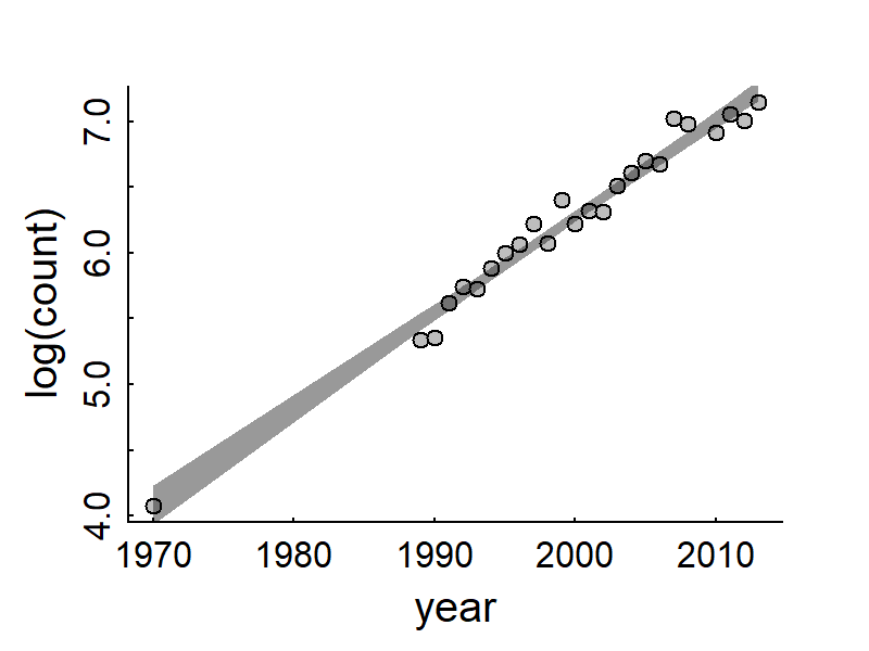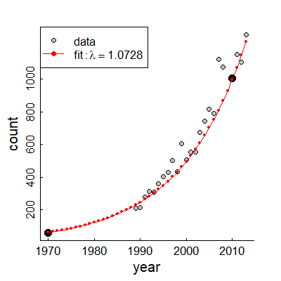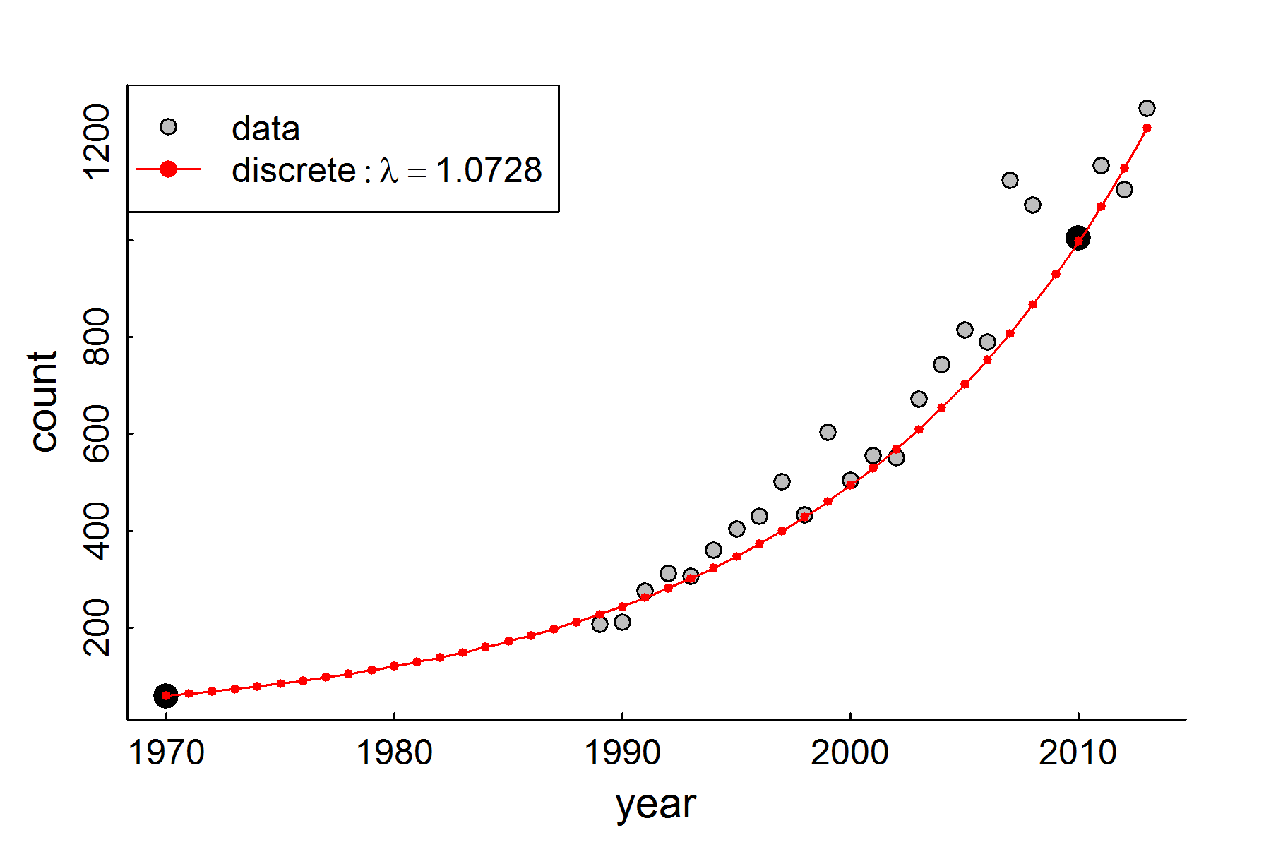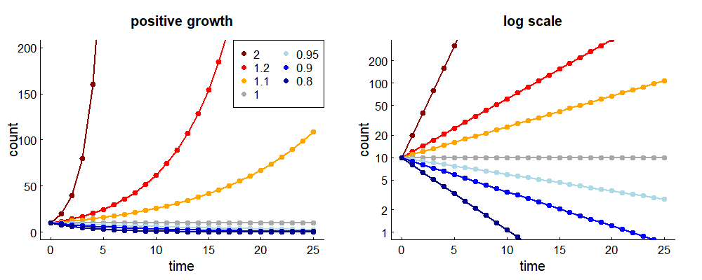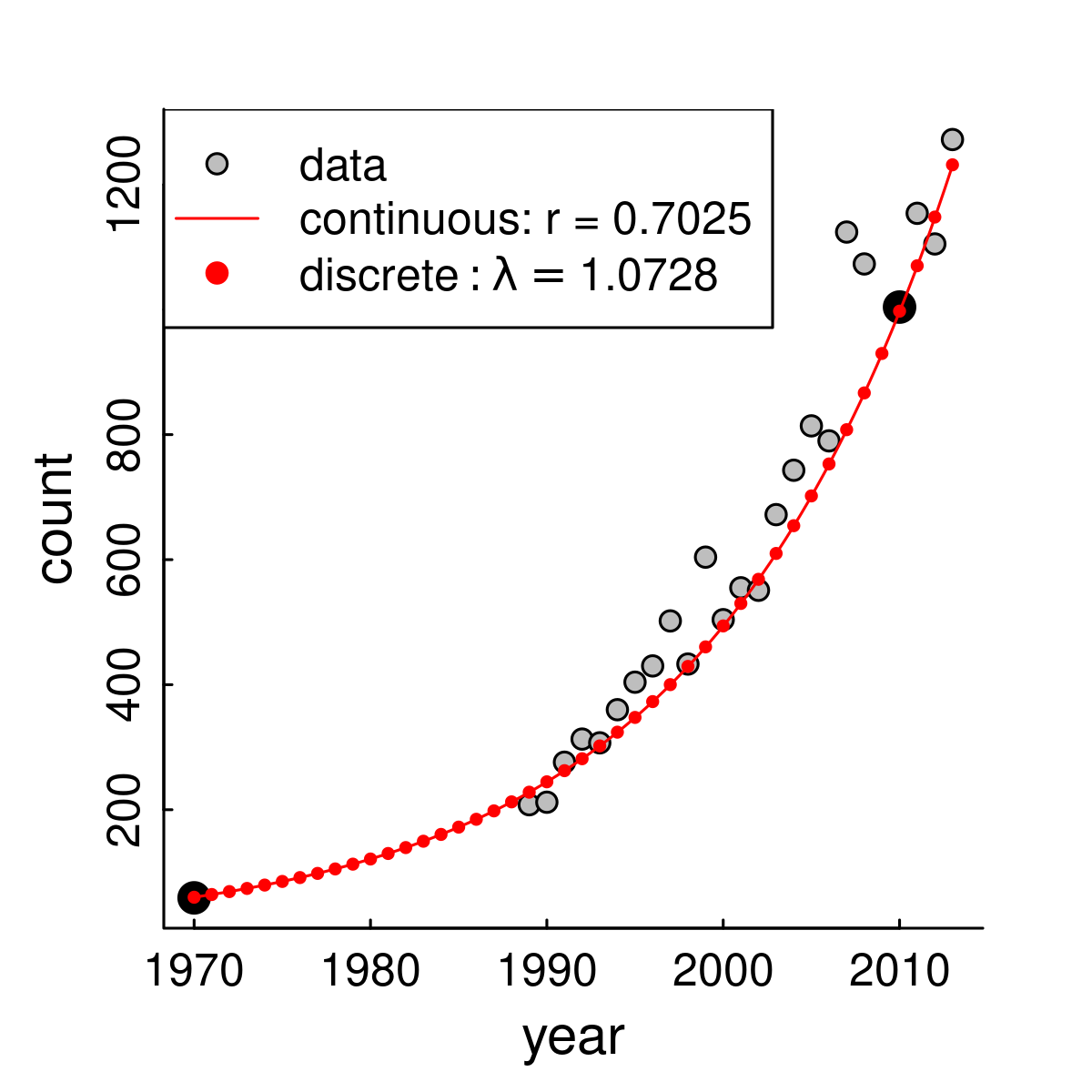 ] .date[ ### October 23, 2025 ] --- <!-- https://bookdown.org/yihui/rmarkdown/xaringan-format.html --> ## Meet ... *Enhydra lutris* .pull-left[  ] .pull-right[ - The largest ... - The smallest ... - The furriest ... * guess how may hairs per in^2^? (*hint, humans are born with ~100,000 TOTAL.*) ] --- ## Sea otters: Range .pull-left-60[] .pull-right-40[*Littorally* the entire North Pacific] --- ## Sea otters: Keystone Species  (Estes et al. 1974) --- .pull-left-60[ ## Sea otters: Furriness > Cuteness  ] .pull-right-30[  ] .pull-left[ - Fur trade (Russian -> British -> American) leads to near **extirpation** across the entire range. - **> 300,000 in 1740 ... < 2,000 in 1900**. - Displacement and indenturing of Indigeneous fishermen (esp. Aleut) ] .pull-right[ > .footnotesize[*... the rush for the otters’ “soft gold” was a predictable boom and bust ... a cautionary example of unsustainable resource use, and a socioeconomic driver of Western — mainly American — involvement in the Pacific region,* (Loshbaugh 2021)] ] --- ## Sea otter reintroduction: Pacific NW Remnant populations from Aleutian Islands ... released in OR, WA, BC and SE-AK 1969 – 1972. .pull-left[] .pull-right[] --- ## Sea otter reintroduction: Washington State ... .pull-left[] .pull-right[ 1970: 60 otters; 2010's: over 1000  ] --- ## Sea otter reintroduction: Washington State ... .pull-left[] .pull-right[ 1970: 60 otters; 2010's: over 1000  ] .center[***Success!***] --- ## Population ecology is all about ... `$$\huge N$$` but where? when? -- ## Here! Now! .. `$$\huge N_t$$` but how many were there? --- ## That many, then `\(\Delta t\)` ago! `$$\Large N_t = N_{t - \Delta t} + \Delta N$$` slight rearrangement: `$$\Large N_{t+1} = N_t + \Delta N$$` For now, `\(\Delta t = 1\)`, i.e. it's the discrete unit that we measure population change. VERY TYPICALLY: `$$\Delta t = 1\,\, \textrm{year}$$`. .darkred.large.center[Why!?] --- ## How does population change? .pull-left-30[ ### **B**irth ### **D**eath ### **I**mmigration ### **E**migration ] .pull-right-70[ `$$\Large N_{t+1} = N_t + (B - D) + (I - E)$$` .center[This is the **Fundamental population equation**.]  ] --- ## Assumption 1: **Closed Population** `$$\Large N_{t+1} = N_t + B - D$$` .pull-left-30[ ### **B**irth ### **D**eath ### .red[**I**mmigration] ### .red[**E**migration] ] .pull-right-70[  ] --- ## Assumption 2: the important one ### The number of **Births** and **Deaths** is *proportional* to **N**. `$$\Large N_{t+1} = N_t + bN_t - dN_t$$` What does that mean? What are the *units* on *b* and *d*? -- .pull-left.darkblue[ **Births** - Every female gives birth to the same number of offspring? - Every female has the same *probability* of giving birth? - Every female has the same *probability* of giving birth to the same *distribution* of offspring? ] .pull-right.darkred[ **Deaths** - A fixed proportion of all individuals dies? - Every individual has the same *probability* of dying? - the *distribution* of probabilities of dying is constant? ] --- ## Some math .... `$$N_{t+1} = (1 + b - d) N_t$$` define `\(\lambda = 1 + b - d\)`. `$$N_{t+1} = \lambda N_t$$` .large[ `\(\lambda\)` is .blue[**rate of growth (or decrease)**] - If `\(d > b\)`, `\(\lambda < 1\)` ... Population FALLS - If `\(b > d\)`, `\(\lambda > 1\)` ... Population GROWS ] --- ## Cranking this forward `$$N_{t+1} = \lambda(N_t)$$` `$$N_{t+2} = \lambda \times N_{t+1} = \lambda^2 N_t$$` `$$N_{t+3} = \lambda^3 N_t$$` `$$N_{t+4} = \lambda^4 N_t$$` In general: `$$\large N_{t+y} = \lambda^y N_t$$` or `$$\huge N_t = \lambda^t N_0$$` .center[***Exponential*** growth.] --- ## Some examples <!-- --> --- ## How fast is exponential/geometric growth? .pull-left-60[  Legend says the inventor of chess (in India) so delighted the raja, he was offered anything he wanted. Inventor said, not much. One grain of rice on one square, 2 on the next, 4 on the next and so on till the board is filled. ] -- .pull-right-40[  Not only is there not enough rice in India to fill such a chessboard, **there are not enough atoms on earth**. ] --- ## Note what the log-scale does <!-- --> It makes .large[VERY VERY LARGE] and .small[very very small] numbers all fit on the same scale! (essentially asks: not *how many grains of rice* but *how many squares on the chessboard*) --- # Note on `\(\lambda\)` vs. `\(r\)` There is also a *continuous time* version of the exponential growth equation that looks like this: `$$\huge{N(t) = N_0 e^{rt}}$$` where `\(r\)` is the *instantaneous growth rate*. The relationship is: .center[ `\(\Large log(\lambda) = r\,\,\,\)` or `\(\,\,\,\Large \lambda = e^r\)` ] These are very similar but where: .pull-left[ `\(\lambda\)` is .blue[(*discrete*) growth rate] - `\(\lambda < 1\)` ... Population FALLS - `\(\lambda > 1\)` ... Population GROWS More frequently used by **wildlife managers**. ] .pull-right-40[ `\(r\)` is .darkred[(*instantaneous*) growth rate] - `\(r < 0\)` ... Population FALLS - `\(r > 0\)` ... Population GROWS More frequently used by **population ecologists**. ] --- ### One place you might have seen `\(r\)` .pull-left[ ] .pull-right[  ] --- ## Estimating some rates ... discrete .pull-left-30[] .pull-right-70[ The amazing thing is, if you have an equation "solved", you only need 2 points on the curve to compute. Let's use the discrete equation: `$$N_{t+y} = \lambda^y N_t$$` `$$1000 = 60 \times \lambda^{40}$$` `$$16.7 = \lambda^{40}$$` `$$2.81 = 40 \times \log (\lambda)$$` `$$0.07025 = \log (\lambda)$$` `$$\lambda = \exp(0.07025) = 1.0728$$` i.e. population increase about `$$7.28\%/year$$`. ] --- ## Washington sea otter fit to data (7.025% discrete growth) .pull-left-70[  ] .pull-right-30[ ### This is an EXCELLENT fit but why isn't it *perfect*? .darkgreen[What are some potential sources of **variation**?] ] --- ## Estimating exponential growth rate from two points .pull-left-50[  ] .pull-right[ We fitted this with just two points: year | N --|-- 1970 | 60 2010 | 1000 .center[ ... some math ... `\(\lambda = 1