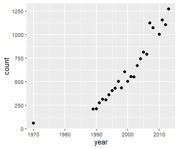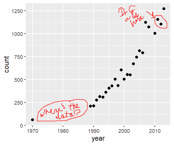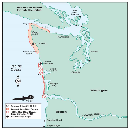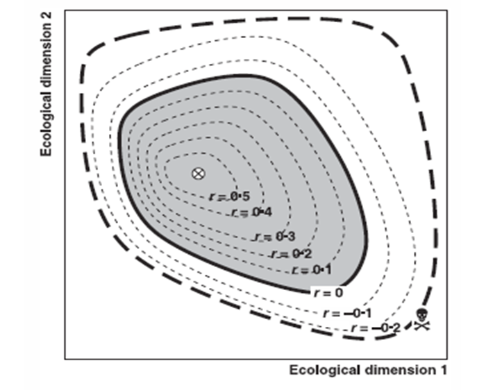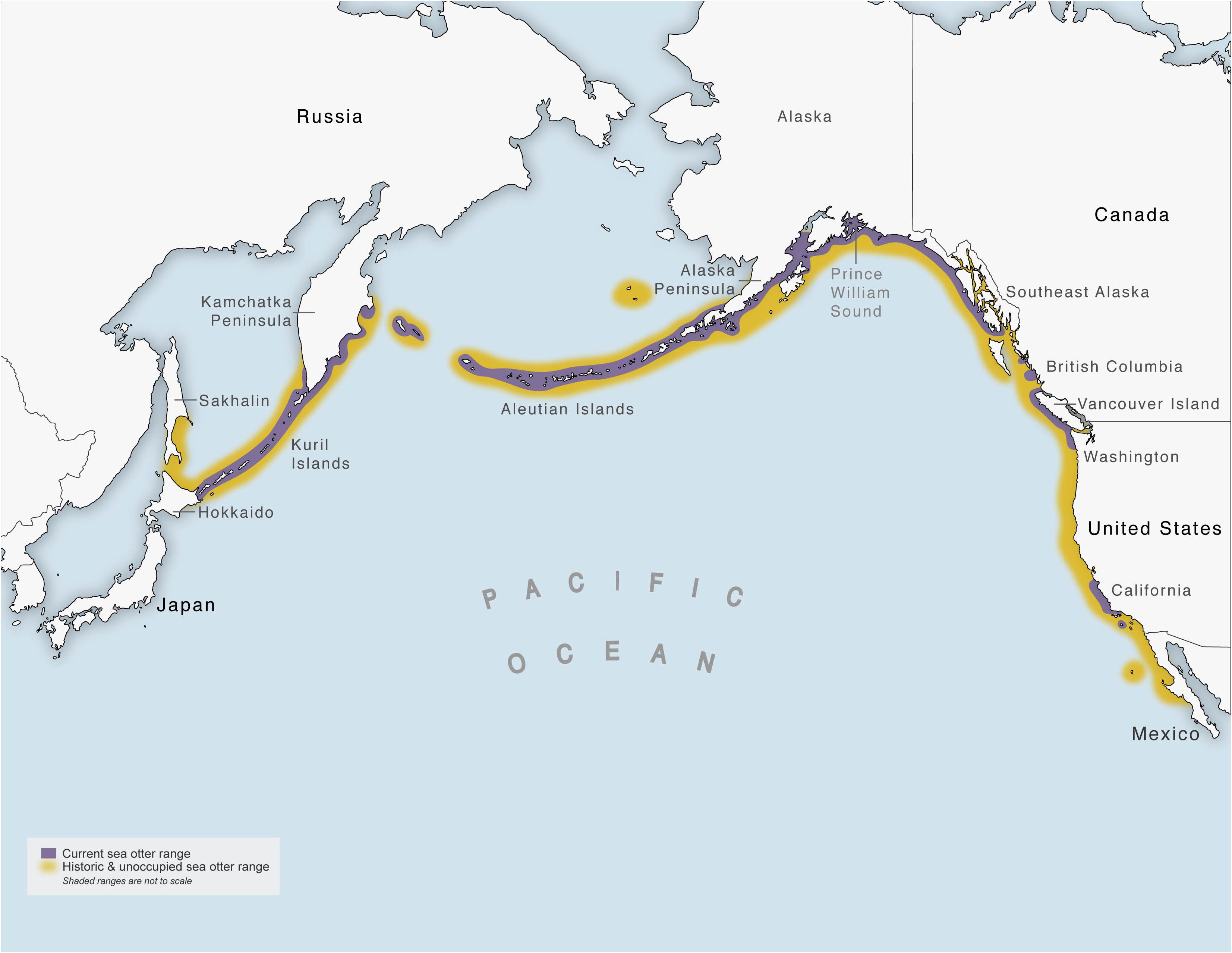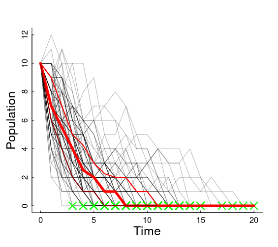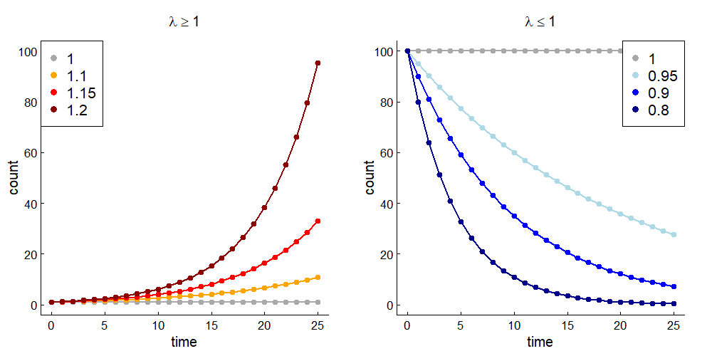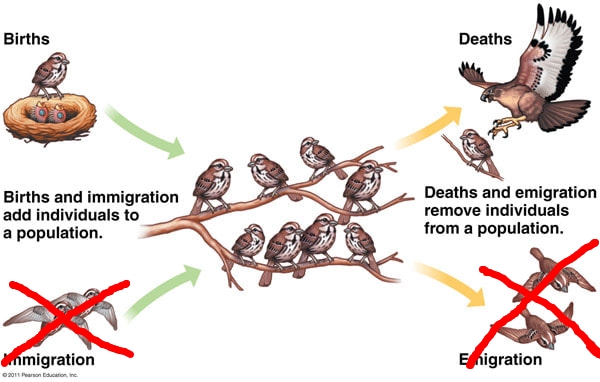 ] .date[ ### October 23, 2025 ] --- <!-- https://bookdown.org/yihui/rmarkdown/xaringan-format.html --> ## Meet ... *Enhydra lutris* .pull-left[  ] .pull-right[ - The largest ... - The smallest ... - The furriest ... * guess how may hairs per in^2^? (*hint, humans are born with ~100,000 TOTAL.*) ] --- ## Sea otters: Range .pull-left-60[] .pull-right-40[*Littorally* the entire North Pacific] --- ## Sea otters: Keystone Species  (Estes et al. 1974) --- .pull-left-60[ ## Sea otters: Furriness > Cuteness  ] .pull-right-30[  ] .pull-left[ - Fur trade (Russian -> British -> American) leads to near **extirpation** across the entire range. - **> 300,000 in 1740 ... < 2,000 in 1900**. - Displacement and indenturing of Indigeneous fishermen (esp. Aleut) ] .pull-right[ > .footnotesize[*... the rush for the otters’ “soft gold” was a predictable boom and bust ... a cautionary example of unsustainable resource use, and a socioeconomic driver of Western — mainly American — involvement in the Pacific region,* (Loshbaugh 2021)] ] --- ## Sea otter reintroduction: Pacific NW Remnant populations from Aleutian Islands ... released in OR, WA, BC and SE-AK 1969 – 1972. .pull-left[] .pull-right[] --- ## Sea otter reintroduction: Washington State ... .pull-left[] .pull-right[ 1970: 60 otters; 2010's: over 1000  ] --- ## Sea otter reintroduction: Washington State ... .pull-left[] .pull-right[ 1970: 60 otters; 2010's: over 1000  ] .center[***Success!***] --- ## Population ecology is all about ... `$$\huge N$$` but where? when? -- ## Here! Now! .. `$$\huge N_t$$` but how many were there? --- ## That many, then `\(\Delta t\)` ago! `$$\Large N_t = N_{t - \Delta t} + \Delta N$$` slight rearrangement: `$$\Large N_{t+1} = N_t + \Delta N$$` For now, `\(\Delta t = 1\)`, i.e. it's the discrete unit that we measure population change. VERY TYPICALLY: `$$\Delta t = 1\,\, \textrm{year}$$`. .darkred.large.center[Why!?] --- ## How does population change? .pull-left-30[ ### **B**irth ### **D**eath ### **I**mmigration ### **E**migration ] .pull-right-70[ `$$\Large N_{t+1} = N_t + (B - D) + (I - E)$$` .center[This is the **Fundamental population equation**.]  ] --- ## Assumption 1: **Closed Population** `$$\Large N_{t+1} = N_t + B - D$$` .pull-left-30[ ### **B**irth ### **D**eath ### .red[**I**mmigration] ### .red[**E**migration] ] .pull-right-70[  ] --- ## Assumption 2: the important one ### The number of **Births** and **Deaths** is *proportional* to **N**. `$$\Large N_{t+1} = N_t + bN_t - dN_t$$` What does that mean? What are the *units* on *b* and *d*? -- .pull-left.darkblue[ **Births** - Every female gives birth to the same number of offspring? - Every female has the same *probability* of giving birth? - Every female has the same *probability* of giving birth to the same *distribution* of offspring? ] .pull-right.darkred[ **Deaths** - A fixed proportion of all individuals dies? - Every individual has the same *probability* of dying? - the *distribution* of probabilities of dying is constant? ] --- ## Some math .... `$$N_{t+1} = (1 + b - d) N_t$$` define `\(\lambda = 1 + b - d\)`. `$$N_{t+1} = \lambda N_t$$` .large[ `\(\lambda\)` is .blue[**rate of growth (or decrease)**] - If `\(d > b\)`, `\(\lambda < 1\)` ... Population FALLS - If `\(b > d\)`, `\(\lambda > 1\)` ... Population GROWS ] --- ## Cranking this forward `$$N_{t+1} = \lambda(N_t)$$` `$$N_{t+2} = \lambda \times N_{t+1} = \lambda^2 N_t$$` `$$N_{t+3} = \lambda^3 N_t$$` `$$N_{t+4} = \lambda^4 N_t$$` In general: `$$\large N_{t+y} = \lambda^y N_t$$` or `$$\huge N_t = \lambda^t N_0$$` .center[***Exponential*** growth.] --- ## Some examples <!-- --> --- ## How fast is exponential/geometric growth? .pull-left-60[  Legend says the inventor of chess (in India) so delighted the raja, he was offered anything he wanted. Inventor said, not much. One grain of rice on one square, 2 on the next, 4 on the next and so on till the board is filled. ] -- .pull-right-40[  Not only is there not enough rice in India to fill such a chessboard, **there are not enough atoms on earth**. ] --- ## Note what the log-scale does <!-- --> It makes .large[VERY VERY LARGE] and .small[very very small] numbers all fit on the same scale! (essentially asks: not *how many grains of rice* but *how many squares on the chessboard*) --- # Note on `\(\lambda\)` vs. `\(r\)` There is also a *continuous time* version of the exponential growth equation that looks like this: `$$\huge{N(t) = N_0 e^{rt}}$$` where `\(r\)` is the *instantaneous growth rate*. The relationship is: .center[ `\(\Large log(\lambda) = r\,\,\,\)` or `\(\,\,\,\Large \lambda = e^r\)` ] These are very similar but where: .pull-left[ `\(\lambda\)` is .blue[(*discrete*) growth rate] - `\(\lambda < 1\)` ... Population FALLS - `\(\lambda > 1\)` ... Population GROWS More frequently used by **wildlife managers**. ] .pull-right-40[ `\(r\)` is .darkred[(*instantaneous*) growth rate] - `\(r < 0\)` ... Population FALLS - `\(r > 0\)` ... Population GROWS More frequently used by **population ecologists**. ] --- ### One place you might have seen `\(r\)` .pull-left[ ] .pull-right[  ] --- ## Estimating some rates ... discrete .pull-left-30[] .pull-right-70[ The amazing thing is, if you have an equation "solved", you only need 2 points on the curve to compute. Let's use the discrete equation: `$$N_{t+y} = \lambda^y N_t$$` `$$1000 = 60 \times \lambda^{40}$$` `$$16.7 = \lambda^{40}$$` `$$2.81 = 40 \times \log (\lambda)$$` `$$0.07025 = \log (\lambda)$$` `$$\lambda = \exp(0.07025) = 1.0728$$` i.e. population increase about `$$7.28\%/year$$`. ] --- ## Washington sea otter fit to data (7.025% discrete growth) .pull-left-70[  ] .pull-right-30[ ### This is an EXCELLENT fit but why isn't it *perfect*? .darkgreen[What are some potential sources of **variation**?] ] --- ## Estimating exponential growth rate from two points .pull-left-50[  ] .pull-right[ We fitted this with just two points: year | N --|-- 1970 | 60 2010 | 1000 .center[ ... some math ... `\(\lambda = 1