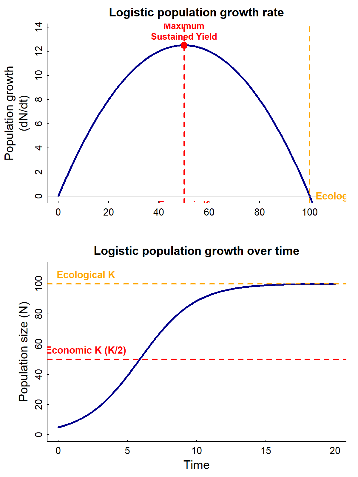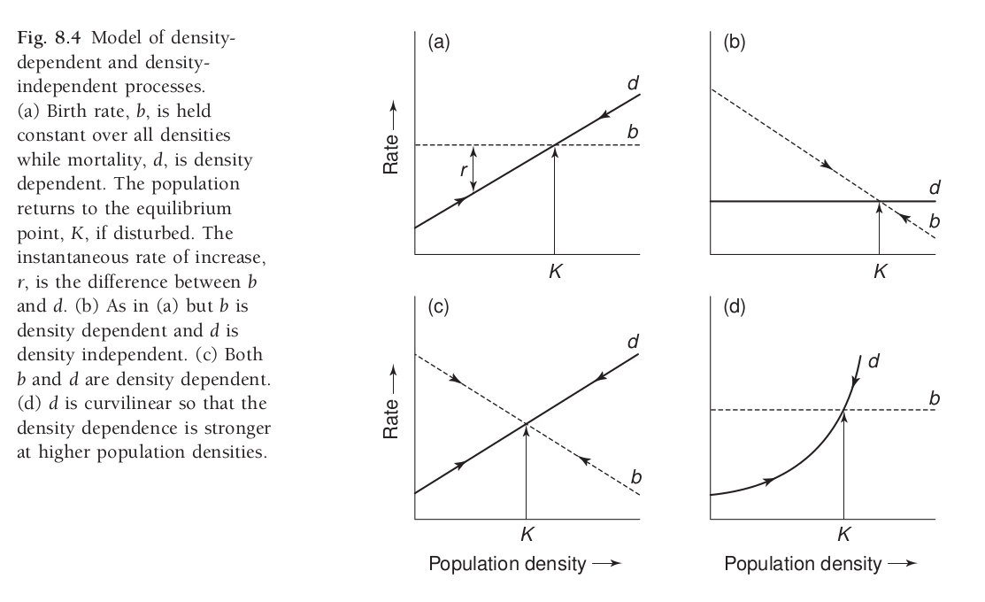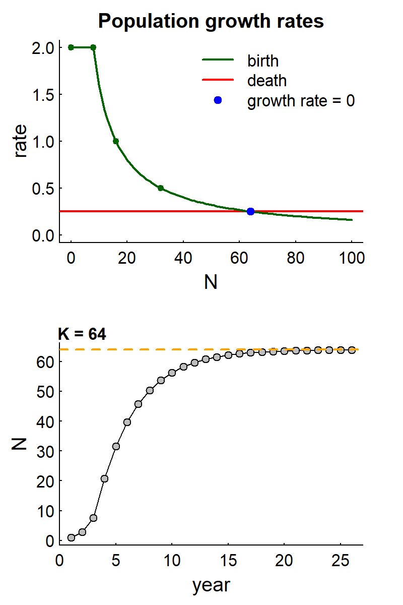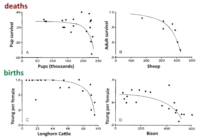 ] .date[ ### October 28, 2025 ] --- <!-- https://bookdown.org/yihui/rmarkdown/xaringan-format.html --> .pull-left-70[ --- ## As populations grow ... ### they always hit **Limits to growth** .content-box-blue.large[ - Space limits - Resource limitations - Competition - Predation - Disease *All of these can interact * ] ] .pull-right-30[  ] --- ## Fundamental population equation `$$\huge \Delta N = B - D + I - E$$` .large[ Exponential growth assumes these (especially .red[**Birth**] & .red[**Death**]) are proportional to .red[**N**]. (in other words, *per capita* death *d* and birth *b* rates are constant) But at high N ... B can fall, or D can rise, or I can decrease or E can increase. ] ### Density dependence .large[ Means that the *rate* of a parameter(e.g. `\(b = {B\over N}\)` or `\(d = {D\over N}\)` is: - (a) NOT constant - (b) dependent on total population (or density) `\(N\)`. ] --- ## Key demographic rates: **Fecundity** & **Survival** .pull-left[ ### Fecundity **Number of offspring produced per individual** (usually per female) .content-box-blue[ **Notation:** - `\(b\)` = fecundity rate - `\(B = b \times N\)` (total births) - Often measured as: - offspring per female per year - litter size × litters per year ] **Examples:** - White-tailed deer: ~1.5 fawns/female/year - Wolves: ~4 pups/female/year (in a pack) - Mice: 5-10 pups/litter, multiple litters/year ] .pull-right[ ### Survival | Mortality **Probability an individuals survives | dies** .content-box-blue[ **Notation:** - `\(s\)` = survival rate (proportion surviving) - `\(d = 1-s\)` death rate - `\(D = d \times N\)` (total deaths) ] **Examples:** - Adult deer: `\(s \approx 0.85\)` (85% survive/year) - equivalently: `\(d \approx 0.15\)` (15% die/year) - Juvenile survival often much lower - Can vary by age, sex, season ] --- .pull-left-50[ ## Example: Wolf populations - Dispersal into new area, mainly wolf mating pairs. - Highly territorial! - Wolves produce up to 4 pups per litter that survive - If there are no neighbors, wolves will disperse to found new packs - Pack with 8 adults or 2 adults, still produces (about) 4 pups per litter - If there are lots of neighbors, packs become larger (more individuals) in smaller territories. <img src='images/WI_WolfTerritorySize.png' width='80%'/> ] .pull-right-50[ **Expansion of Wisconsin Wolves, 1970's to 2000's**  ] --- ## Human-wolf experiment model .pull-left-60[ ### basics of model - 8 possible territories - 1 initial dispersing wolf (female) ### each season ... - One female / pack gives birth to 2 offspring - Offspring can choose whether to disperse or not - 1/4 of all wolves die each year ] .pull-right-40[  ] Enter data [here](https://docs.google.com/spreadsheets/d/15j2b3FCfbtrPkAlRb6QE6s55aRqggeSDi5YU6OBh7Yc/edit?usp=sharing) --- class: inverse ## Results of Human Wolf Experiment .center[ Looks a lot like initial exponential growth stabilizes around 20 ind as die-offs balance out births. ] --- .pull-left[ # Modeling wolf population Population equation: `$$N_t = (1 + b - d) \times N_{t-1}$$` Death rate is constant: `\(d = 0.25\)` Birth rate is high when population is low: `\(b_0 = 2\)` Birth rate is small when population is high: - `\(N = 1\)`; `\(B = 2\)`; `\(b = 2\)` - `\(N = 8\)`; `\(B = 16\)`; `\(b = 2\)` But it hits an absolute maximum of 16 total. So if: - `\(N = 32\)`; `\(B = 16\)`; `\(b = 1/2\)` - `\(N = 64\)`; `\(B = 16\)`; `\(b = 1/4\)` ] .pull-right-40[ <!-- --> ] --- .pull-left-60[ ## Some Concepts - Natural populations are always eventually limited - The "cap" on a population is called the .darkred[***Carrying Capacity*** ] (symbol: **K**). This is - When population rates (*b*, *d*, also *i*, *e*) depend on the **total population**, this is called: .darkred[***Density Dependence***]. - The maximum growth rate (max `\(b-d\)`) is called the .darkred[**intrinsic growth rate**]. ] .pull-right-40[ <!-- --> ] --- .pull-left[ # Logistic growth .darkred[***Logistic growth***] is a specific kind of .darkred[Density Dependent] growth where the relationship between ***r*** and ***N*** is .darkred[**linear**]. The formula is: `$$r = r_0 (1 - N/K)$$` <img src="Lecture_PopulationEcology_PartII_files/figure-html/unnamed-chunk-3-1.png" width="100%" /> ] .pull-right[ <!-- --> - At `\(N=0\)` - growth = 0 - At `\(N\)` slightly above 0 - growth maximum `\(\approx r_0\)` - At `\(N = K\)` - growth = `\(0\)` - At `\(N > K\)` - growth < `\(0\)` ] --- ## Exponential vs. Logistic Growth in Three Graphs .pull-left[ ***Exponential*** | ***Growth*** ---:|:--- equation: | `\({dN \over dt} = r N\)` solution: | `\(N(t) = N_0e^{rt}\)` ] .pull-right[ ***Logistic*** | ***Growth*** ---:|:--- equation: | `\({dN \over dt} = r_0 N\left(1-{N\over K}\right)\)` solution: | `\(N(t) = {K \over 1 + \left({K-N_0 \over N_0}\right)e^{-r_0 t}}\)` ] <br>  --- ## Intrinsic growth rate: `\(r_0\)` .pull-left-40[ ***In the best of all possible worlds*** .large[ `$$\large r_0 = 1.5 \, W^{-0.36}$$` ] `\(W\)` is live weight in kilograms <table class="table table-striped" style="font-size: 16px; color: black; margin-left: auto; margin-right: auto;"> <thead> <tr> <th style="text-align:left;"> Species </th> <th style="text-align:right;"> Weight (kg) </th> <th style="text-align:right;"> r₀ </th> <th style="text-align:right;"> Doubling time (years) </th> </tr> </thead> <tbody> <tr> <td style="text-align:left;"> Mouse </td> <td style="text-align:right;"> 0.02 </td> <td style="text-align:right;"> 6.13 </td> <td style="text-align:right;"> 0.1 </td> </tr> <tr> <td style="text-align:left;"> White-tailed Deer </td> <td style="text-align:right;"> 60 </td> <td style="text-align:right;"> 0.34 </td> <td style="text-align:right;"> 2.0 </td> </tr> <tr> <td style="text-align:left;"> Elephant </td> <td style="text-align:right;"> 4000 </td> <td style="text-align:right;"> 0.08 </td> <td style="text-align:right;"> 8.7 </td> </tr> </tbody> </table> **Q. Why would this be the case?** .large[Smaller animals: shorter generation times, larger litte