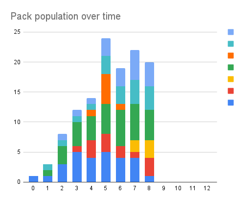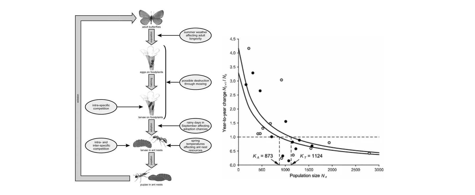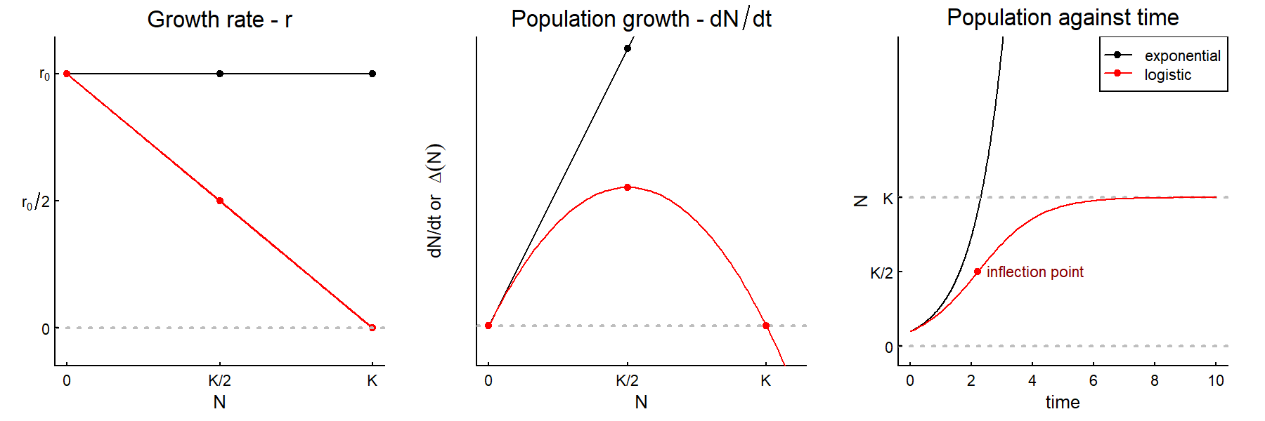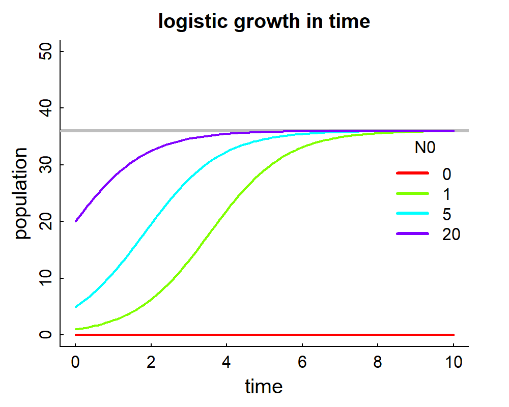 ] .date[ ### October 28, 2025 ] --- <!-- https://bookdown.org/yihui/rmarkdown/xaringan-format.html --> .pull-left-70[ --- ## As populations grow ... ### they always hit **Limits to growth** .content-box-blue.large[ - Space limits - Resource limitations - Competition - Predation - Disease *All of these can interact * ] ] .pull-right-30[  ] --- ## Fundamental population equation `$$\huge \Delta N = B - D + I - E$$` .large[ Exponential growth assumes these (especially .red[**Birth**] & .red[**Death**]) are proportional to .red[**N**]. (in other words, *per capita* death *d* and birth *b* rates are constant) But at high N ... B can fall, or D can rise, or I can decrease or E can increase. ] ### Density dependence .large[ Means that the *rate* of a parameter(e.g. `\(b = {B\over N}\)` or `\(d = {D\over N}\)` is: - (a) NOT constant - (b) dependent on total population (or density) `\(N\)`. ] --- ## Key demographic rates: **Fecundity** & **Survival** .pull-left[ ### Fecundity **Number of offspring produced per individual** (usually per female) .content-box-blue[ **Notation:** - `\(b\)` = fecundity rate - `\(B = b \times N\)` (total births) - Often measured as: - offspring per female per year - litter size × litters per year ] **Examples:** - White-tailed deer: ~1.5 fawns/female/year - Wolves: ~4 pups/female/year (in a pack) - Mice: 5-10 pups/litter, multiple litters/year ] .pull-right[ ### Survival | Mortality **Probability an individuals survives | dies** .content-box-blue[ **Notation:** - `\(s\)` = survival rate (proportion surviving) - `\(d = 1-s\)` death rate - `\(D = d \times N\)` (total deaths) ] **Examples:** - Adult deer: `\(s \approx 0.85\)` (85% survive/year) - equivalently: `\(d \approx 0.15\)` (15% die/year) - Juvenile survival often much lower - Can vary by age, sex, season ] --- .pull-left-50[ ## Example: Wolf populations - Dispersal into new area, mainly wolf mating pairs. - Highly territorial! - Wolves produce up to 4 pups per litter that survive - If there are no neighbors, wolves will disperse to found new packs - Pack with 8 adults or 2 adults, still produces (about) 4 pups per litter - If there are lots of neighbors, packs become larger (more individuals) in smaller territories. <img src='images/WI_WolfTerritorySize.png' width='80%'/> ] .pull-right-50[ **Expansion of Wisconsin Wolves, 1970's to 2000's**  ] --- ## Human-wolf experiment model .pull-left-60[ ### basics of model - 8 possible territories - 1 initial dispersing wolf (female) ### each season ... - One female / pack gives birth to 2 offspring - Offspring can choose whether to disperse or not - 1/4 of all wolves die each year ] .pull-right-40[  ] Enter data [here](https://docs.google.com/spreadsheets/d/15j2b3FCfbtrPkAlRb6QE6s55aRqggeSDi5YU6OBh7Yc/edit?usp=sharing) --- class: inverse ## Results of Human Wolf Experiment .center[ Looks a lot like initial exponential growth stabilizes around 20 ind as die-offs balance out births. ] --- .pull-left[ # Modeling wolf population Population equation: `$$N_t = (1 + b - d) \times N_{t-1}$$` Death rate is constant: `\(d = 0.25\)` Birth rate is high when population is low: `\(b_0 = 2\)` Birth rate is small when population is high: - `\(N = 1\)`; `\(B = 2\)`; `\(b = 2\)` - `\(N = 8\)`; `\(B = 16\)`; `\(b = 2\)` But it hits an absolute maximum of 16 total. So if: - `\(N = 32\)`; `\(B = 16\)`; `\(b = 1/2\)` - `\(N = 64\)`; `\(B = 16\)`; `\(b = 1/4\)` ] .pull-right-40[ <!-- --> ] --- .pull-left-60[ ## Some Concepts - Natural populations are always eventually limited - The "cap" on a population is called the .darkred[***Carrying Capacity*** ] (symbol: **K**). This is - When population rates (*b*, *d*, also *i*, *e*) depend on the **total population**, this is called: .darkred[***Density Dependence***]. - The maximum growth rate (max `\(b-d\)`) is called the .darkred[**intrinsic growth rate**]. ] .pull-right-40[ <!-- --> ] --- .pull-left[ # Logistic growth .darkred[***Logistic growth***] is a specific kind of .darkred[Density Dependent] growth where the relationship between ***r*** and ***N*** is .darkred[**linear**]. The formula is: `$$r = r_0 (1 - N/K)$$` <img src="Lecture_PopulationEcology_PartII_files/figure-html/unnamed-chunk-3-1.png" width="100%" /> ] .pull-right[ <!-- --> - At `\(N=0\)` - growth = 0 - At `\(N\)` slightly above 0 - growth maximum `\(\approx r_0\)` - At `\(N = K\)` - growth = `\(0\)` - At `\(N > K\)` - growth < `\(0\)` ] --- ## Exponential vs. Logistic Growth in Three Graphs .pull-left[ ***Exponential*** | ***Growth*** ---:|:--- equation: | `\({dN \over dt} = r N\)` solution: | `\(N(t) = N_0e^{rt}\)` ] .pull-right[ ***Logistic*** | ***Growth*** ---:|:--- equation: | `\({dN \over dt} = r_0 N\left(1-{N\over K}\right)\)` solution: | `\(N(t) = {K \over 1 + \left({K-N_0 \over N_0}\right)e^{-r_0 t}}\)` ] <br>  --- ## Intrinsic growth rate: `\(r_0\)` .pull-left-40[ ***In the best of all possible worlds*** .large[ `$$\large r_0 = 1.5 \, W^{-0.36}$$` ] `\(W\)` is live weight in kilograms <table class="table table-striped" style="font-size: 16px; color: black; margin-left: auto; margin-right: auto;"> <thead> <tr> <th style="text-align:left;"> Species </th> <th style="text-align:right;"> Weight (kg) </th> <th style="text-align:right;"> r₀ </th> <th style="text-align:right;"> Doubling time (years) </th> </tr> </thead> <tbody> <tr> <td style="text-align:left;"> Mouse </td> <td style="text-align:right;"> 0.02 </td> <td style="text-align:right;"> 6.13 </td> <td style="text-align:right;"> 0.1 </td> </tr> <tr> <td style="text-align:left;"> White-tailed Deer </td> <td style="text-align:right;"> 60 </td> <td style="text-align:right;"> 0.34 </td> <td style="text-align:right;"> 2.0 </td> </tr> <tr> <td style="text-align:left;"> Elephant </td> <td style="text-align:right;"> 4000 </td> <td style="text-align:right;"> 0.08 </td> <td style="text-align:right;"> 8.7 </td> </tr> </tbody> </table> **Q. Why would this be the case?** .large[Smaller animals: shorter generation times, larger litte