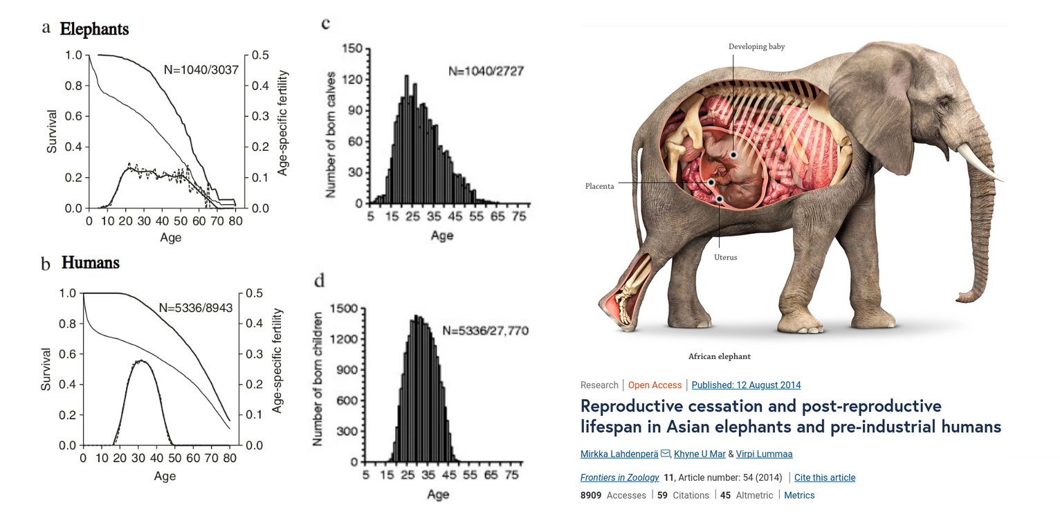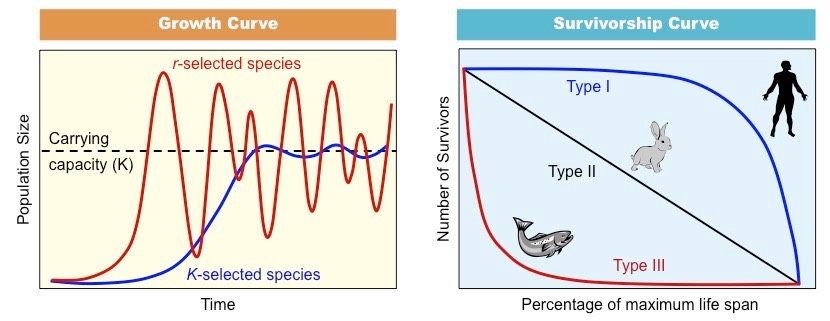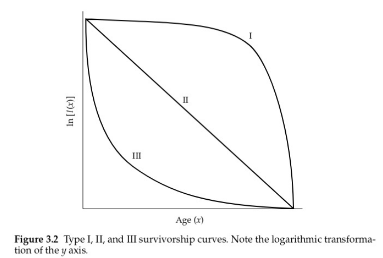 ] .date[ ### October 30, 2025 ] --- <!-- https://bookdown.org/yihui/rmarkdown/xaringan-format.html --> ## So far ... We've studied this equation: `\(\huge N_t = N_{t-1} + B_t - D_t\)` with two assumptions: .pull-left.darkblue[ ### Exponential Growth **Births** and **Deaths** __proportional__ to **N** ] .pull-right.darkgreen[ ### Logistic Growth **Births** decrease and/or **Deaths** decrease (.green[linearly?]) with **N** ] --- ## More complex topics in population ecology Blowing up: `$$\huge N_t$$` **into:** | | | |---|----| | sex / age classes: | **structured populations** | | multiple sub-populations: | **meta-populations** | | multiple species: | **competitors / predator-prey** | | infected, susceptible, recovered: | **disease dynamics** | --- ## Drilling into structure of Birth and Death .blue[ `$$\Large N_t = N_{t-1} + B_t - D_t$$` ] .box-blue[ .pull-left[ .large[**B** = Births] - **Fecundity** = `#` births / female / unit time (*unit time* can be any unit of time, but is usually year) ] .pull-right[ .large[**D** = Deaths] - **Mortality (rate)** = probability of death / unit time - **Survival (rate)** = 1 - Mortality rate ] ] --- .pull-left-60[ ## **Basic fact of life I:** Survival varies with age!  - **Survival Probability** ( `\(S_0, S_1, S_2, ...\)` ) always between 0 and 1. - **Cumulative Survival** ( `\(1, S_0, S_0 S_1, S_0 S_1 S_2, ...\)` ) always starts at 1 and goes to 0 .center[([Altukhov et al. 2015](https://journals.plos.org/plosone/article?id=10.1371/journal.pone.0127292) )] ] .pull-right-40[    ] --- ## **Basic fact of life II:** Fecundity varies with age!  .center[([Lahdenperä et al. 2015](https://frontiersinzoology.biomedcentral.com/articles/10.1186/s12983-014-0054-0))] --- background-image: url("images/KhanLifeHistory.png") background-size: cover class:white ## .white[**Life History** is the reproduction / mortality pattern] --- ## Survival curves .pull-left-60[  ] .pull-right-40.large[ - **TYPE I:** high survivorship for juveniles; most mortality late in life - **TYPE II:** survivorship (or mortality) is relatively constant throughout life - **TYPE III:** low survivorship for juveniles; survivorship high once older ages are reached ] --- # Life history strategies: *r*-selected, vs. *K*-selected species For a long time a popular **paradigm** (conceptual model purporting to explain a wide range of phenomenon) for understanding evolutionary drivers of life-history variation. Still popularly taught: .center[  ] --- background-image: url("images/walrusoysters.png") background-position: center background-size: contain .pull-left-30[ ### r-selected species #### strategy: - lots of offspring - little or no parental investment - semelparous - early maturity - Type III survivorship - low survivorship - short life-expectancy #### drivers: - small size - unstable / unpredictable environments #### consequence - highly fluctuating populations ] .pull-right-30[ ### K-selected species #### strategy: - few offspring - lots of parental investment - high survivorship - late maturity - iteroparous - long life-expectancy - Type I survivorship schedule #### drivers: - stable environments - large #### consequence - more stable / slowly-fluctuating populations ] --- ## Nice theory you've got there, but lots of counter-examples .pull-left[ - What about **trees**? They're big, they're long-lived (very **K**), but they produce and disperse a **heckload** of seeds (very, very **r**). ] .pull-right[ - What about **iteroparous** species (**K**) that are hedging their bets against high inter-annual variation in environmental conditions (very **r**)? ] > .green[The r- and K-selection paradigm was focussed on **density-dependent selection**. This paradigm was challenged as it became clear that ... **age-specific mortality** provide[s] a more mechanistic link between an environment and an **optimal life history** ...] ([Reznick et al. (2002) Ecology](https://esajournals.onlinelibrary.wiley.com/doi/full/10.1890/0012-9658%282002%29083%5B1509%3ARAKSRT%5D2.0.CO%3B2)) --- background-image: url("images/salmonids.png") background-size: cover ## Salmonid (counter)-example <br><br><br> .center.large[ **Semelparous species** Much bigger eggs (189 > 86 mg). Also nest building and guarding behavior, before dying, i.e. greater investment in **Juvenile Survival** over **Adult Survival**. The iteros just keep staying alive and trying to breed again and again. ] -- .pull-left.center[ > Inconsistent with **r**-**K** paradigm! ] --- .pull-left[ ### Tasmanian devil (*Sarcophilus harrisii*) .center[<img src='images/tazzy.jpg' width='70%'/>] Only marsupial carnivore | range restricted to Tasmania .pull-left[ .darkred[Dying of *facial tumor disease*; an infectious cancer (!) which kills nearly all adults > 3 years ]] .pull-right[] ] -- .pull-right-40[ ### Switch to Semelparity .green[**Previously:** Longer-lived, and iteroparous, with later birth (over 1 year old)]  .darkblue[**Now:** Semelparous, one-shot, younger mothers (almost NO 2-3 year old animals!)] ([Jones et al. (2013)](https://doi.org/10.1073/pnas.0711236105)) ] --- ## *Monoceros academicus*: Three Life Stages . | Larva | Sophomore | Emeritus | --- |:----------:|:------:|:---:| . | <img src='images/unicornlarva.webp' height='150px'/> | <img src='images/unicornstudent.jpg' height='150px'/> | <img src='images/oldunicorn.webp' height='150px%'/> | <font size = 5> Survival | <font size = 5> 0.5 |<font size = 5>1 | <font size = 5>0 | <font size = 5> Fecundity |<font size = 5> 0 | <font size = 5>1.5 | <font size = 5>0.5 | |||| > - **Survival** is a **probability** (unitless) > > - **Fecundity** is an **expected number** of offspring (n. ind.). </center> -- **Human experiment:** 8 volunteers please. --- .pull-left-40[ ## Experiment: results Stage | Survival | Fecundity ----------|------|--- 1. larvae | 0.5 | 0 2. sophomore | 1 | 1 3. emeritus | 0 | .5 See numerical experiment: https://egurarie.shinyapps.io/AgeStructuredGrowth/ ] .pull-right-60[ <img src="Lecture_Popu