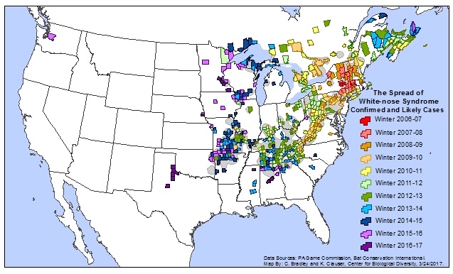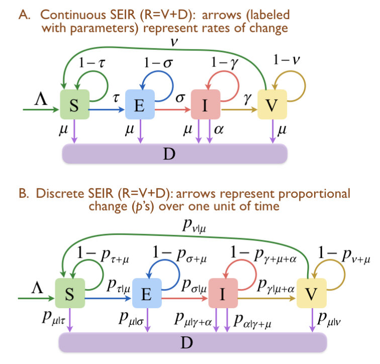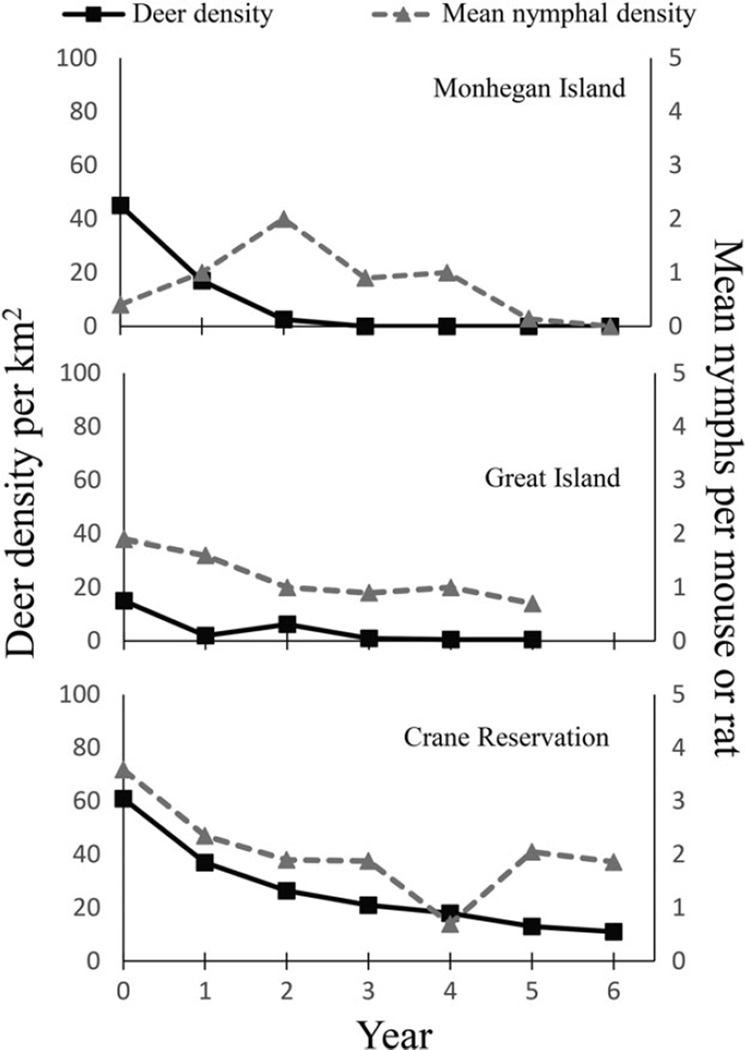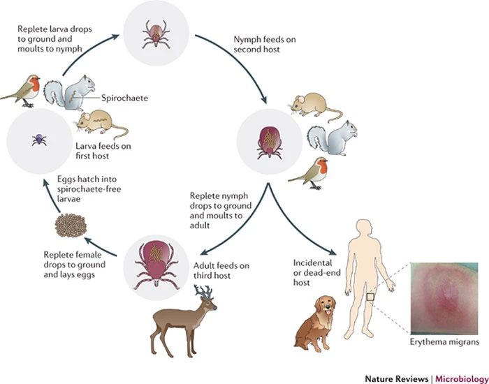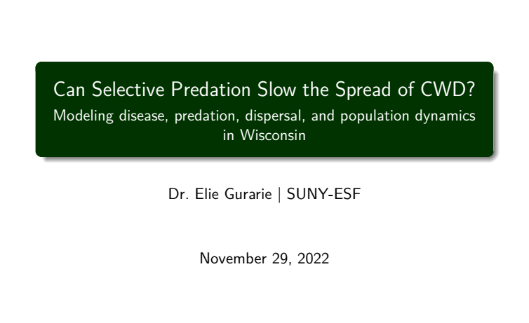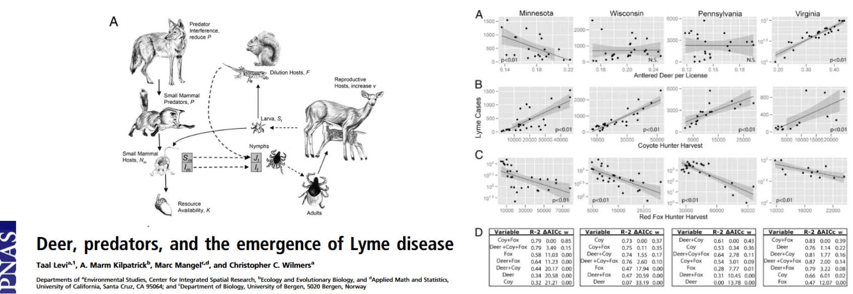 ] .subtitle[ ## EFB 390: Wildlife Ecology and Management ] .author[ ### Dr. Elie Gurarie ] .date[ ### November 4, 2025 ] --- <!-- https://bookdown.org/yihui/rmarkdown/xaringan-format.html --> .pull-left-60[ ## First, some slides on Body Condition **Fecundity** and **Survival** both depend very much on **body condition**. **Body condition** is measured in many ways, for example:. > .small[ We analysed two metrics of body condition: i) a direct subcutaneous **fat score (categorical, 1-5)**, assessed by palpating the belly-loin, with the badger laterally recumbent, and ii) a **body condition index (BCI)** estimated using a ratio-based approach for each capture: log (body mass)/log (body length). ] European badger (*Meles meles*): .pull-right-50[] ] .pull-right-40[ <br><br>  .center[[(Ross et al. 2021)](https://www.sciencedirect.com/science/article/pii/S2666900521000228)] ] --- ## Remote assessments of body condition .pull-left-30[ Field measurements made using categorical assessments. ] .pull-right-70[] --- .pull-left-30[ ## Other measurements #### Note invasive measures Kidney fat - healthy mammals Bone marrow fat - informative for non-healthy mammals ] .pull-right-70[ .center[([Sanchez et al. 2018](https://onlinelibrary.wiley.com/doi/epdf/10.1111/ele.13160))] ] --- # Considerations of measuring body condition .pull-left-40[ Short- and long-term effects of a stressor all need to be considered, and are measured differently (and have different consequences).  .center[***Any idea what this is!?***] ] .pull-right-60[] --- .pull-left[ ## Influences on body condition - **Food availability** - including (often) high seasonal variation - These relationships make **Body Condition** a good proxy for **Habitat Quality** - **Disease and parasite loads** - **Stress** - from human, predator impacts, or social interactions ] .pull-right[ ## Consequences of (poor) body condition - Lower **survival** & lower **fecundity** - Varies by age - Often - physiological energetic trade-offs between **survival** and **reproduction** (less gonadal growth, later maturation, skipped estrus) - Population level impacts - mechanisms of **Density Dependence** ] --- background-image: url("images/Chytridiomycosis.jpg") background-size: cover class:inverse #Back to Wildlife Disease --- .pull-left[ ## Why do we care? .large[ They affect humans - **Wildlife** <-> **Human** transmission They affect animals - Population = Birth + Immigration - Emigration - **DEATH** **Pathogens** are also part of the ecosystem! ]] -- .pull-right[ ## Disease Ecology is super interesting! .large[ .pull-left[ - Ecology - Behavior - Medicine - Evolution - Genetics - Immunology - Epidemiology - Modeling - Trophic Interactions ] .pull-right[ - Hosts - Intermediate hosts - Pathogens - Predator-mediation - Biotic/abiotic environments - Climate Change ]]] --- class: inverse <iframe src="https://www.youtube.com/embed/o5ECFLG2EwI?controls=0" width="900" height="600" frameborder="0" allowfullscreen> </iframe> #### "***the most interesting job in all of state service***" <!-- https://www.youtube.com/watch?v=59STc4gg4wI&ab_channel=WyomingGameandFishDepartment--> --- class: large ## Some Definitions ### **Pathogen:** infectious biological agent that causes disease or illness to its host #### .large[Bacteria | Viruses | Fungi | Other] ### **Vector:** a host that can transmit but is not itself affected by a pathogen ### **Zoonotic Disease:** a human disease of wildlife origin ### **Natural Reservoir:** population of organisms or specific environment in which an infectious pathogen lives and reproduces ### **Infectivity:** ability of a pathogen to establish an infection. ### **Virulence / Pathogenicity:** (severe or fatal cases) / (total cases) --- background-image: url("images/rabid_dog.webp") background-size: cover # .yellow[**Zoonotic diseases**] ### .yellow[(because they affect humans)] -- .pull-left[] --- ## Zoonotic diseases .pull-left-40[ **Emerging infectious diseases per decade**  ] .pull-right-60[ 60% of EID are caused by zoonotic pathogens. 72% of zoonotic EID origins in **wildlife** (vs. domesticated) origin.  **Note prominence of NE. US!** ([Jones et al. 2008](https://www.nature.com/articles/nature06536)) ] --- .pull-left-40[ ## Example: **Rabies**  .small[http://europepmc.org/article/PMC/6899062] ] .pull-right[ <br> **Rabies** is an *encephalitis* (brain inflammation) for *most* mammals. Spread by *Lyssavirus* (family of viruses) spread through saliva. The disease (cleverly!) modifies behavior to make spread via saliva more likely: - aggressiveness leading to biting. - excrutiating pain when swallowing / hydrophobia, Largely **asymptomatic** bat *reservoir*, leaks into spillover infections to, esp., domestic dogs & humans. **Effective vaccines exist!!** (in fact, developed by Louis Pasteur in 1885) ] --- .center[## Rabies vectors] .pull-left[ In the US (**where rabies is very very rare**) - almost all carriers are wild animals. Variants are (usually) species-specific. Wild animal vectors depend on local ecology.  .small[ [www.cdc.gov](https://www.cdc.gov/rabies/location/usa/surveillance/wild_animals.html) ] ] .pull-right-50[  ] --- .pull-left[ ## How to manage **Rabies**? - Dog management (stray control / muzzling / vaccination) - Vigilance - Removal of infected animals - Vaccination! (trap / release or oral)  ] -- .pull-right[  ### Including the wild ones ] --- .pull-left-60[ ## Example: **Lyme Disease**  .small[Nature.com] ] .pull-right-40[ ### Most prevalent vector-borne disease in N. America **Pathogen:** *Borrelia burgedorferi* (bacteria) Transmitted by *Ixodes* ticks, via complicated, multi-stage growth (larvae / nymph / adult). **Each stage** must independently pick up the bacteria. Does **not** affect most hosts! Only humans / dogs / some cattle. ~476,000 people / year infected and treated in US. ] ??? Uninfected larvae hatch and seek a host to feed on, which is typically a small mammal or bird, but may include larger animals. Because *Borrel