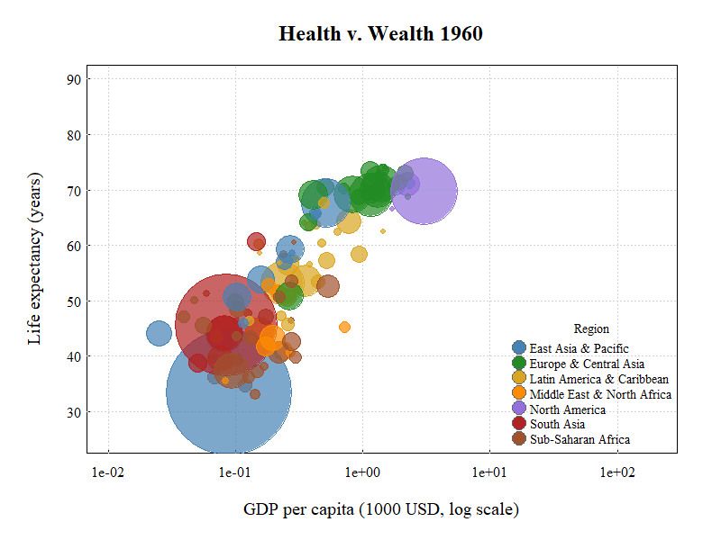 ] --- class: inverse # Loops --- ## Simple `for` loop ``` r for(i in 1:10) print(i) ``` ``` ## [1] 1 ## [1] 2 ## [1] 3 ## [1] 4 ## [1] 5 ## [1] 6 ## [1] 7 ## [1] 8 ## [1] 9 ## [1] 10 ``` `i` is the loop variable — it takes each value in the sequence, one at a time. - `i` is the most common name (**index**), but it's arbitrary. --- ## Pay attention to notation ``` r names <- c("Aditya", "Bob", "Changzi", "Demetrious", "Ed") # indexing style: i goes from 1 to the length of the vector for(i in 1:length(names)) print(nchar(names[i])) ``` ``` ## [1] 6 ## [1] 3 ## [1] 7 ## [1] 10 ## [1] 2 ``` --- ## Pre-allocate a container Often you want to *save* results from a loop, not just print them. Make an empty container first, then fill it in. ``` r nchars <- rep(NA, length(names)) for(i in 1:length(names)) nchars[i] <- nchar(names[i]) nchars ``` ``` ## [1] 6 3 7 10 2 ``` --- ## Loop variable doesn't have to be an integer (or `i`) ``` r for(n in names){ print(n) print(nchar(n)) } ``` ``` ## [1] "Aditya" ## [1] 6 ## [1] "Bob" ## [1] 3 ## [1] "Changzi" ## [1] 7 ## [1] "Demetrious" ## [1] 10 ## [1] "Ed" ## [1] 2 ``` --- ## Saving results with element-based looping Using a named vector: ``` r nchars <- rep(NA, length(names)) names(nchars) <- names for(n in names) nchars[n] <- nchar(n) nchars ``` ``` ## Aditya Bob Changzi Demetrious Ed ## 6 3 7 10 2 ``` --- ## Avoiding loops with `apply` In R, loops can often be avoided with the `apply` family of functions: ``` r sapply(names, nchar) ``` ``` ## Aditya Bob Changzi Demetrious Ed ## 6 3 7 10 2 ``` Also `plyr` / `dplyr` / tidyverse — we'll discuss this later. > It is not very "R" to use a lot of loops! --- class: inverse # Uses of loops --- ## True iteration Some problems genuinely require loops because each step depends on the previous one. ### Fibonacci sequence ``` r fib <- rep(NA, 12) fib[1] <- 1 fib[2] <- 1 for(i in 3:length(fib)){ fib[i] <- fib[i-1] + fib[i-2] } fib ``` ``` ## [1] 1 1 2 3 5 8 13 21 34 55 89 144 ``` --- ## Fibonacci in Nature .pull-left[ <br><br><br>  ] .pull-right[ ] --- ## A natural thing to wrap in a function .pull-left[ ``` r computeFib <- function(n){ fib <- rep(NA, n) fib[1] <- 1 fib[2] <- 1 for(i in 3:length(fib)){ fib[i] <- fib[i-1] + fib[i-2] } fib } ``` ] .pull-right[ ``` r (f30 <- computeFib(30)) ``` ``` ## [1] 1 1 2 3 5 8 13 21 34 55 89 144 233 377 ## [15] 610 987 1597 2584 4181 6765 10946 17711 28657 46368 75025 121393 196418 317811 ## [29] 514229 832040 ``` ``` r f30[30]/f30[29] ``` ``` ## [1] 1.618034 ``` Compare to golden ratio: `\(\large 1+\sqrt{5} \over 2\)` ``` r (1+sqrt(5))/2 ``` ``` ## [1] 1.618034 ``` ] --- .pull-left[ ## Loop in loop ``` r x <- seq(-5,5,.05) y <- seq(-5,5,.05) A <- matrix(NA, nrow = length(x), ncol = length(y)) for(i in 1:length(x)) for(j in 1:length(y)) A[i,j] <- cos(x[i]^2) * cos(y[j]^2) ``` ] .pull-right[ ``` r image(x,y,A, asp = 1) ``` <img src="loops_slides_files/figure-html/unnamed-chunk-14-1.png" alt="" style="display: block; margin: auto;" /> ] --- ## Looping through files A very common real-world use: processing a batch of data files. ``` files <- list.files("path/to/csvs") ``` Example file listing from a CTT wildlife tracking project: ``` [1] "CTT-V3033D437786-blu.2026-03-11_014627.csv" [2] "CTT-V3033D437786-blu.2026-03-11_024628.csv" [3] "CTT-V3033D437786-blu.2026-03-11_044631.csv" [4] "CTT-V3033D437786-blu.2026-03-11_164645.csv" [5] "CTT-V3033D437786-blu.2026-03-12_044659.csv" ... ``` ``` r for(f in files){ mycsv <- read.csv(f) # do something with mycsv } ``` --- ## `while` loops A `while` loop repeats as long as a condition is `TRUE`. The condition is checked *before* each iteration. Example below runs the Fibonacci iteration up to a certain value: ``` r fib <- c(1, 1) while(fib[length(fib)] < 1000){ fib <- c(fib, fib[length(fib)] + fib[length(fib)-1]) } fib ``` ``` ## [1] 1 1 2 3 5 8 13 21 34 55 89 144 233 377 610 987 1597 ``` --- ## Be careful! .pull-left[ If the condition never becomes `FALSE`, the loop runs forever: ``` r # Do NOT run this x <- 2 while(x > 1){ x <- x + 1 cat(paste(x, " ")) } ``` ] .pull-right[ Often, you can put in an `if` statement and `stop` or `break` command to break a loop: ``` r x<- 2 while(x > 1){ x <- x + 1 cat(paste(x, " ")) if(x > 100) stop("woah!") } ``` Though here - of course - it's easier to just put a roof: `while(x < 100)` ] --- ## Example: finding the maximum of a function ``` r funkycurve <- function(x) x^2 * sin(x) / (1 + x) curve(funkycurve(x), xlim = c(0, 5), lwd = 2) ``` <img src="loops_slides_files/figure-html/unnamed-chunk-19-1.png" alt="" style="display: block; margin: auto;" /> --- ## Finding the max with a `while` loop A simple `while` loop to find the max between 0 and 5 within a tolerance of 0.001: .pull-left[ ``` r lo <- 0; hi <- 5; tol <- 0.001 while((hi - lo) > tol){ mid <- (lo + hi) / 2 if(funkycurve(mid + tol) > funkycurve(mid - tol)){ lo <- mid } else { hi <- mid } } ``` ] .pull-right[ ``` r mid ``` ``` ## [1] 2.125854 ``` ``` r funkycurve(mid) ``` ``` ## [1] 1.228714 ``` ] > Think through how this algorithm works.... --- ## Visualize the result ``` r curve(funkycurve(x), xlim = c(0, 5), lwd = 2) abline(v = mid, lty = 2, col = "red", lwd = 2) ``` <img src="loops_slides_files/figure-html/unnamed-chunk-22-1.png" alt="" style="display: block; margin: auto;" /> --- ## Looping through years of WDI data ``` r load("WDI_allyears.rda") with(WDI, table(country)) ``` --- ## Define a plotting function .small[ ``` r plotWDI <- function(myyear, ...){ cols <- c("East Asia & Pacific" = "steelblue", "Europe & Central Asia" = "forestgreen", "Latin America & Caribbean" = "goldenrod", "Middle East & North Africa" = "darkorange", "North America" = "mediumpurple", "South Asia" = "firebrick", "Sub-Saharan Africa" = "sienna") mywdi <- subset(WDI, year == myyear) mywdi_big <- mywdi[order(mywdi$Population, decreasing = TRUE),][1:10,] cont_col <- cols[match(mywdi$region, levels(mywdi$region))] cex_pop <- sqrt(mywdi$Population / max(mywdi$Population, na