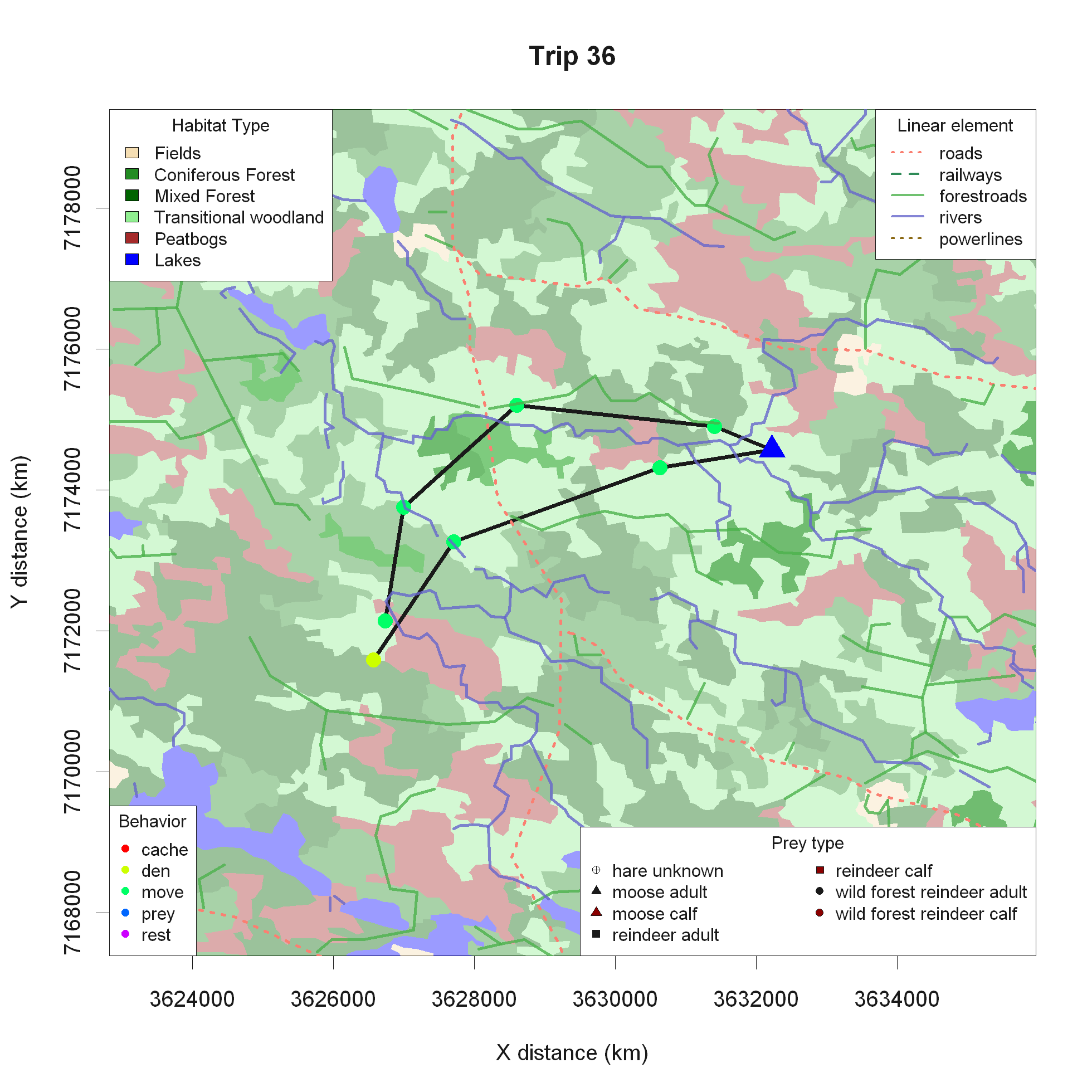 In-depth summer predation study, questions related to habitat use, landscape type - forest/bog/field - linear elements - roads/rivers/power lines, etc.