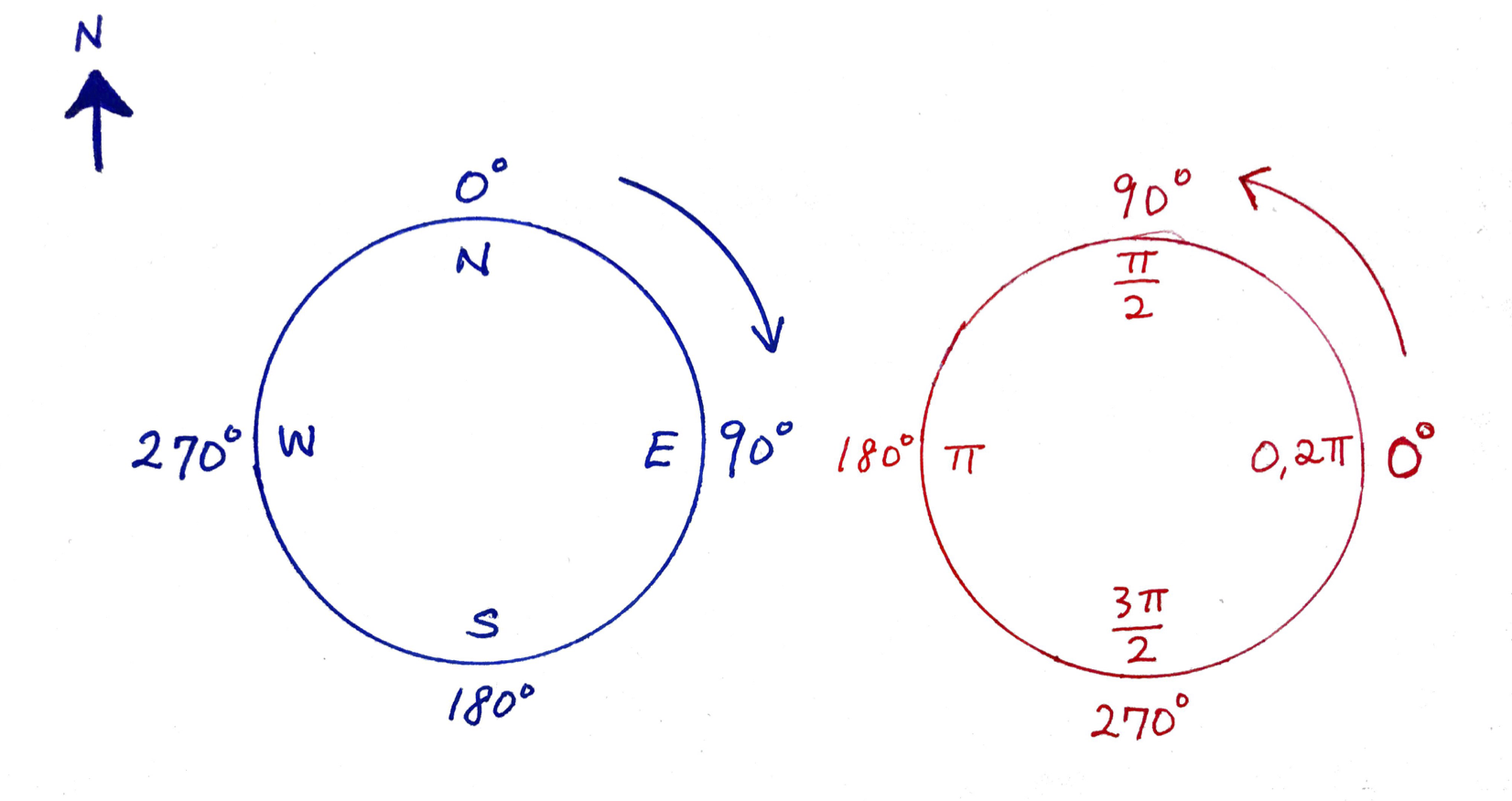 Note, the orientations are in radians, i.e. range from \(0\) to \(2\pi\) going counter-clockwise from the \(x\)-axis. Compass directions go from 0 to 360 clockwise, so, to convert: