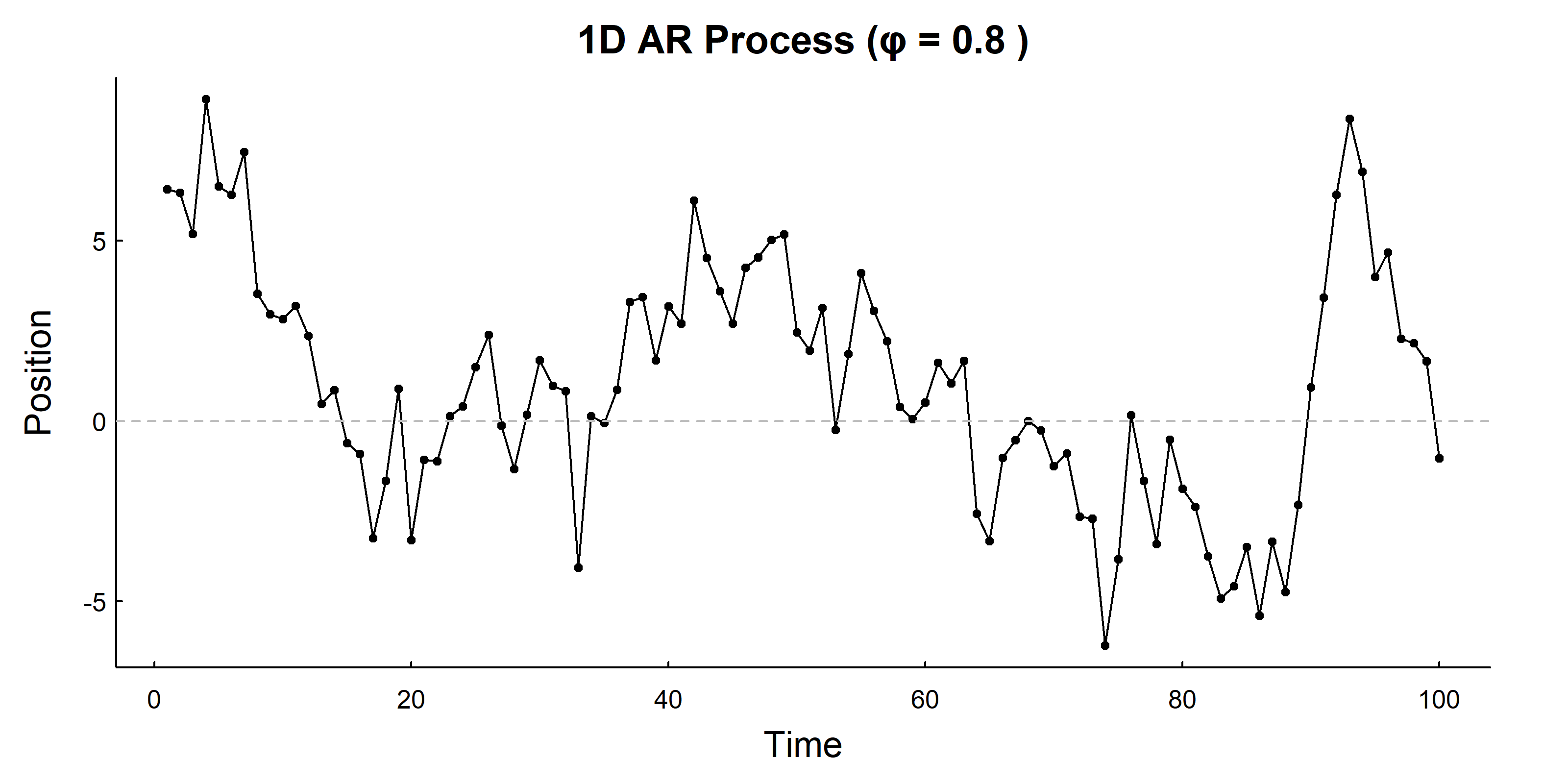 # Function to simulate 1D AR processAR1D<-function(n=100, sigma=2, phi=0.8, mu=0){X<-numeric(n)X[1]<-rnorm(1, 0, sigma)for(iin2:n){X[i]<-phi*X[i-1]+rnorm(1, 0, sigma)}X+mu}# Simulatesigma<-2phi<-0.8n<-100X<-AR1D(n, sigma, phi)# Visualizepars()plot(1:length(X), X, type ="o", xlab ="Time", ylab ="Position", main =paste("1D AR Process (φ =", phi, ")"), pch =19, cex =0.5)abline(h =0, lty =2, col ="grey")