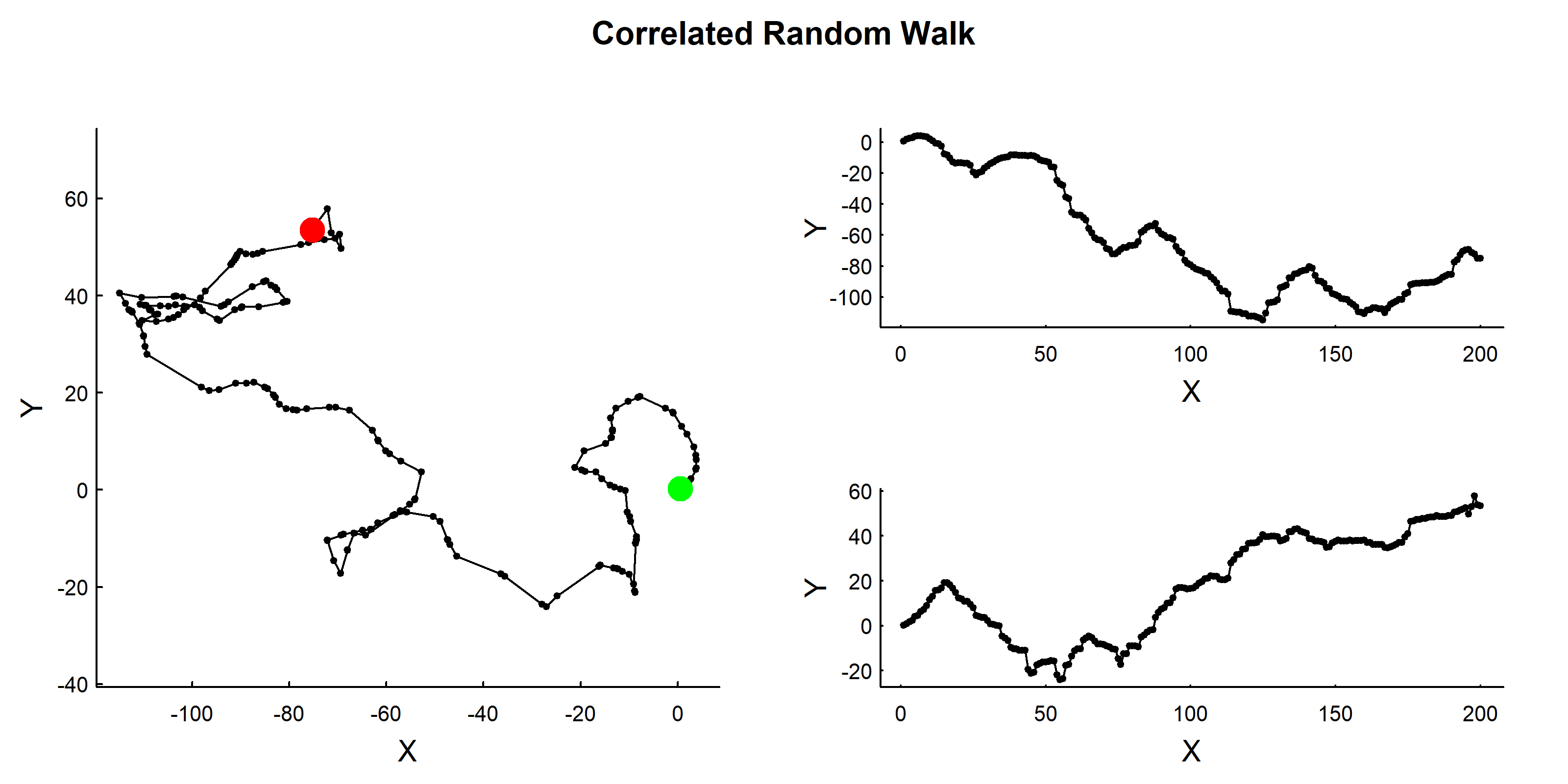 It bears noting that while Kareiva and Shigesada (1983) coined the term and acronym CRW, and provided a nice foundataional piece of analysis to go with it, this model was studied extremely exhaustively in a pair of papers from the 1950s by Patlak (1953a), Patlak (1953b). In these largely forgotten papers the effect of various forms of correlation and anisotropy in individual movement steps are related to diffusion approximations, with explicit derivations of expected displacements and rigorous tests for external orientation. Patlak considers a discretization of movement that consists of step lengths l, the turning angles \(\theta\) and time intervals \(t\) drawn from some arbitrary distributions and predicted the displacements and theoretical rates of diffusion for such movers in terms of the mean and variance or step lengths, the mean cosine of turning angles, and the mean time interval. The analysis was exhaustive, but too far ahead of the data to be applied in any meaningful way.