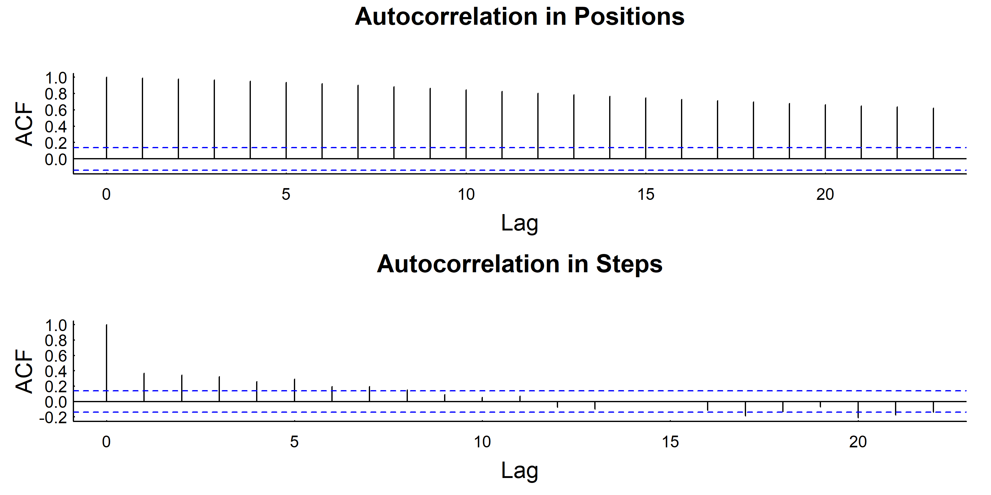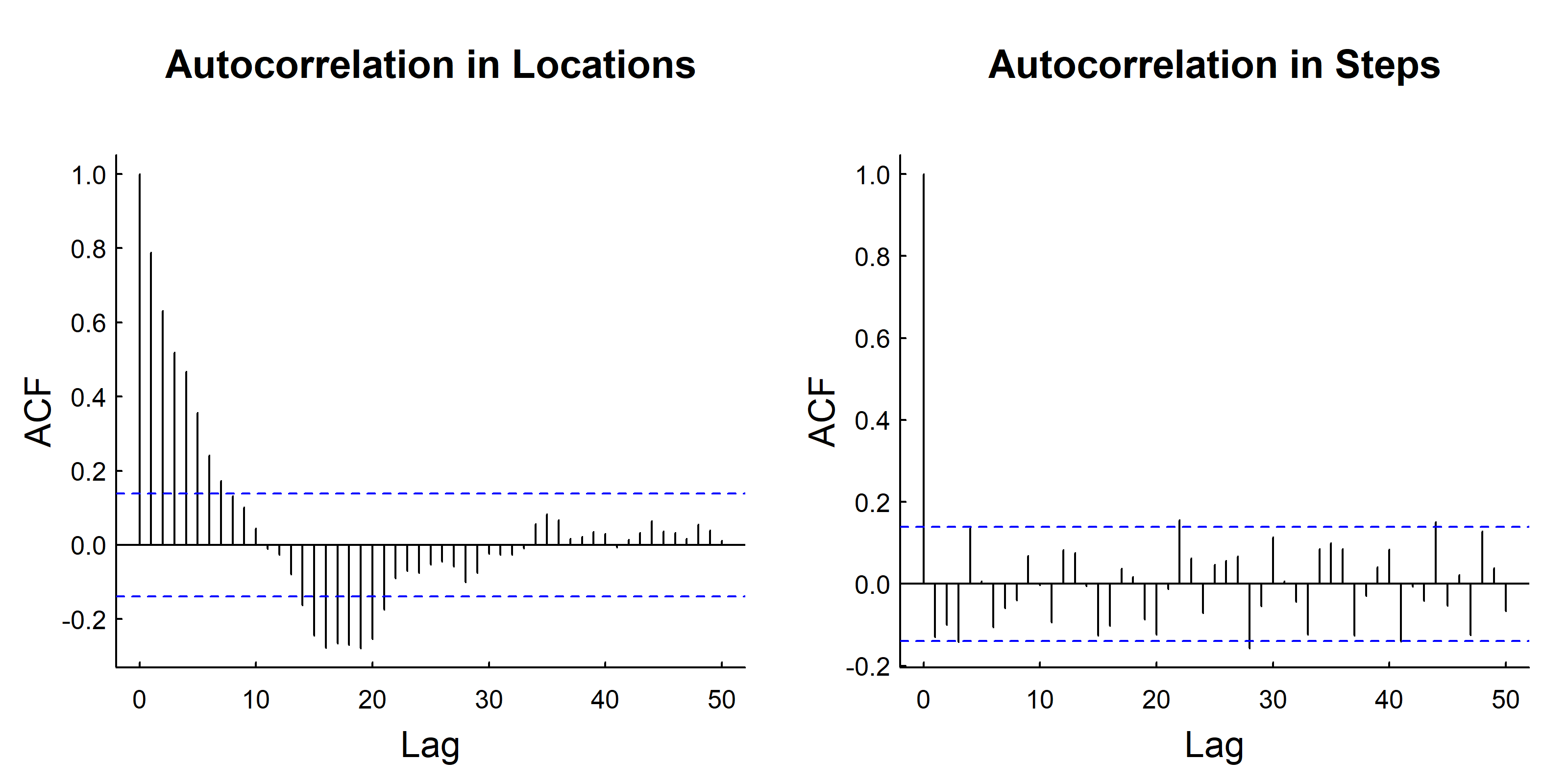 acf(Re(Z), main ="Autocorrelation in Locations", lag.max =50)acf(Re(diff(Z)), main ="Autocorrelation in Steps", lag.max =50)