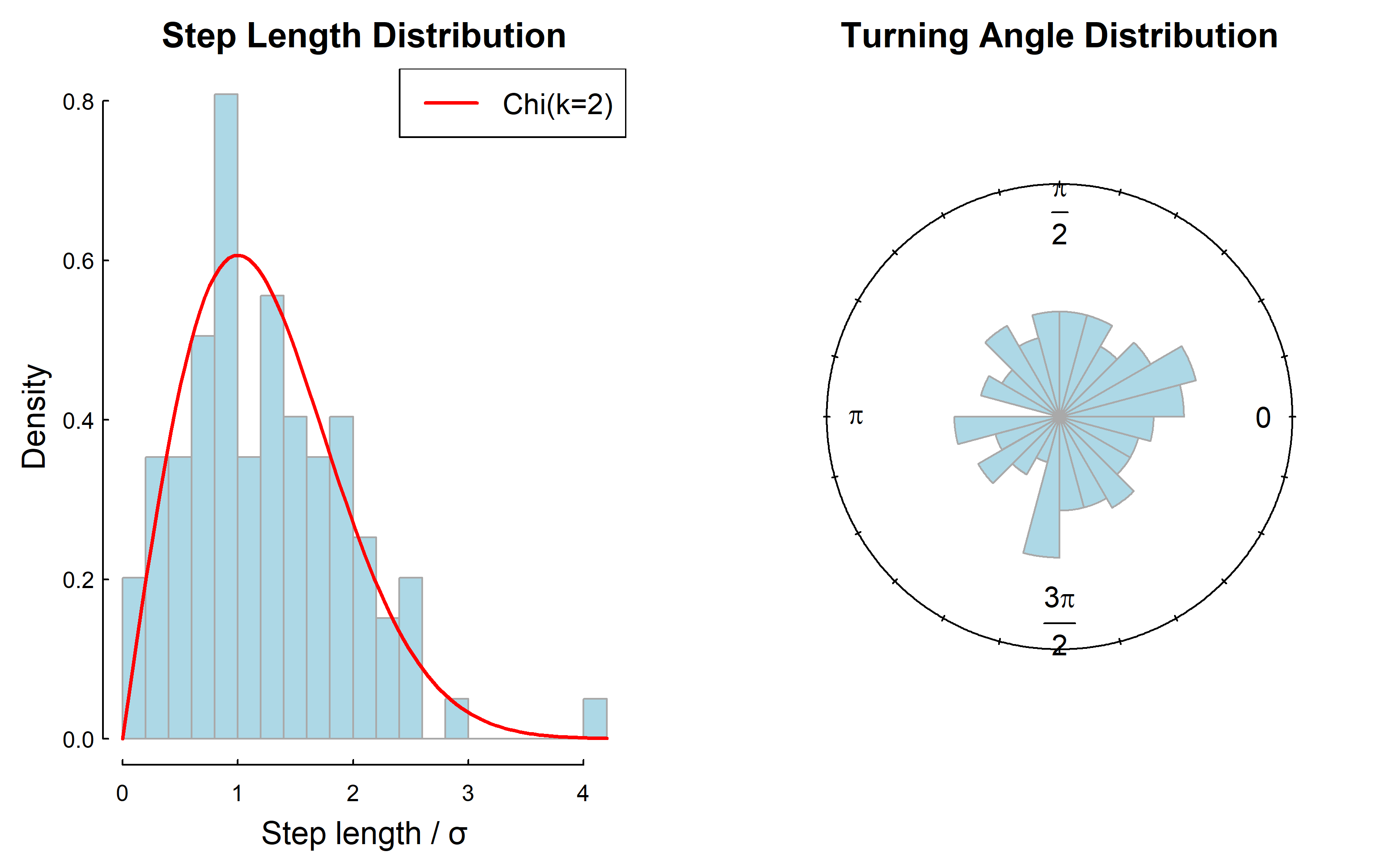 Key properties: - Turning angles are uniformly distributed: \(\theta \sim \text{Unif}(-\pi, \pi)\) - Step lengths follow a Chi distribution with k=2 - Expected step length: \(E(|S|) = \sqrt{2}\sigma\)