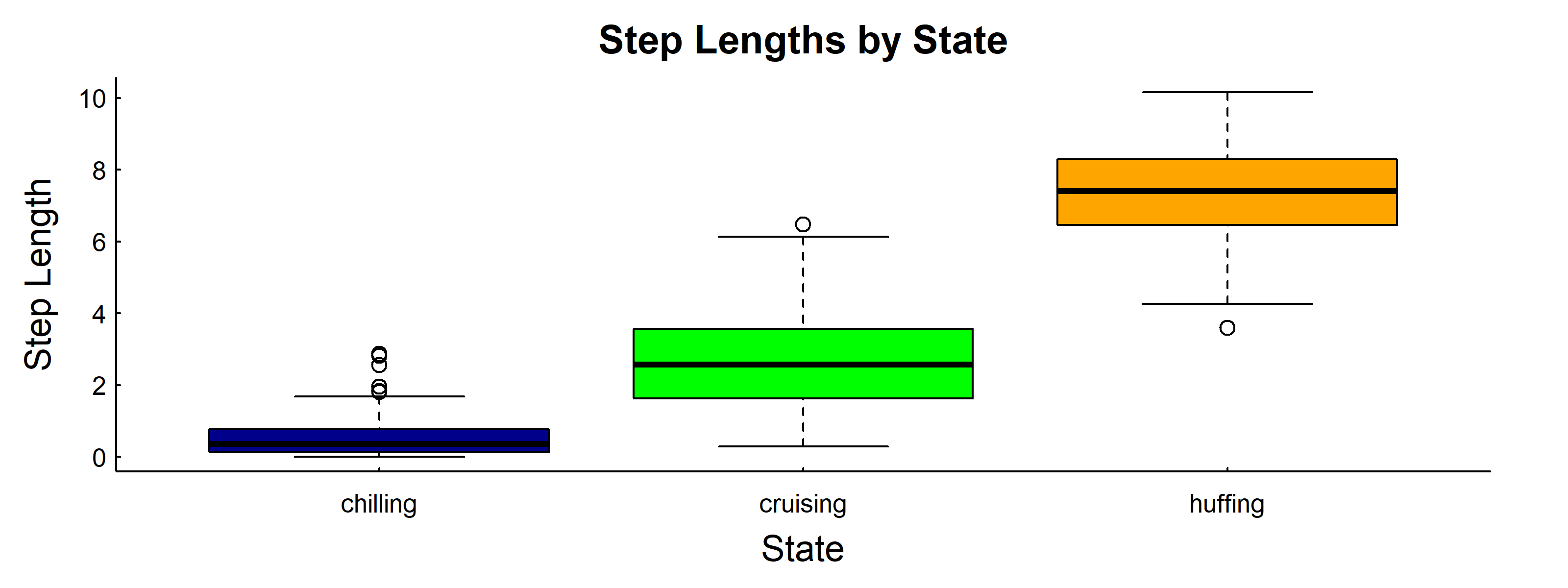 boxplot(step_lengths~State_mc, col =cols, xlab ="State", ylab ="Step Length", names =rownames(M), main ="Step Lengths by State")