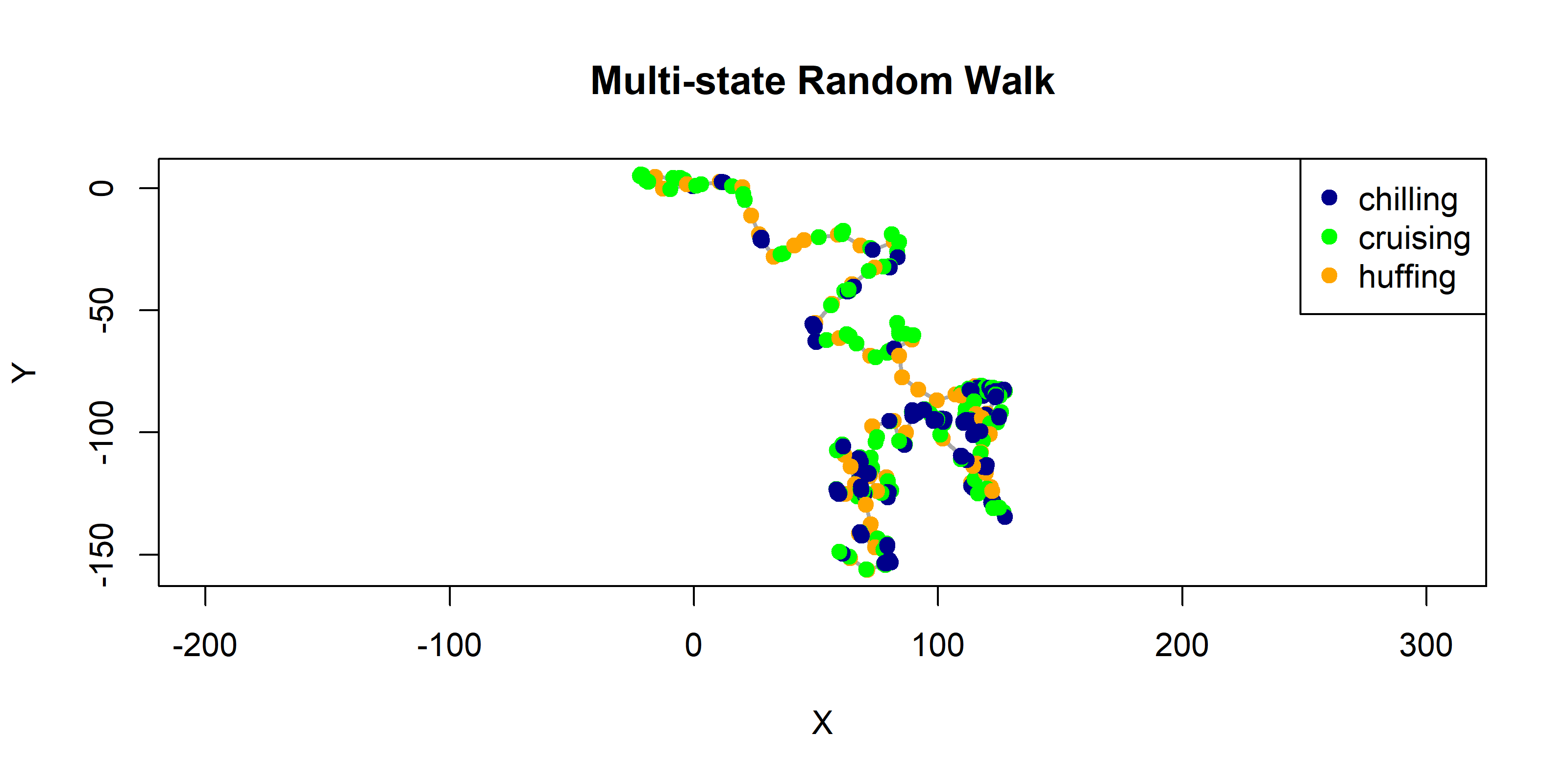 Animals often switch between behavioral states (e.g., resting, foraging, traveling). We can model this using a Multi-state Random Walk where movement parameters depend on the behavioral state.