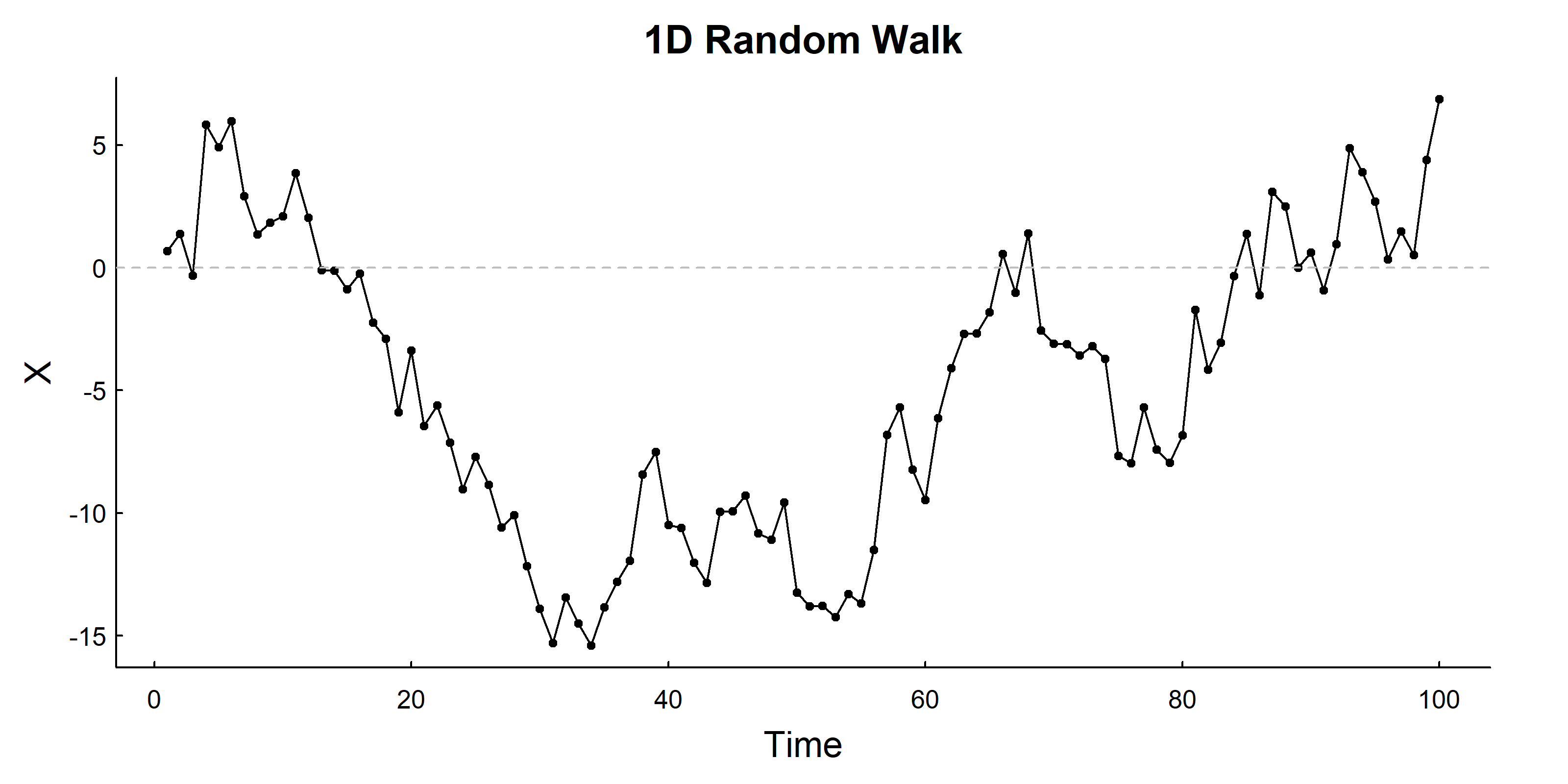 A random walk, in general, is a process where the location is a cumulative sum of a series of steps. The 1-dimensional random walk, where each step (not each location) is drawn from a normal distribution. \[X_t = X_{t-1} + \sigma W_t\]