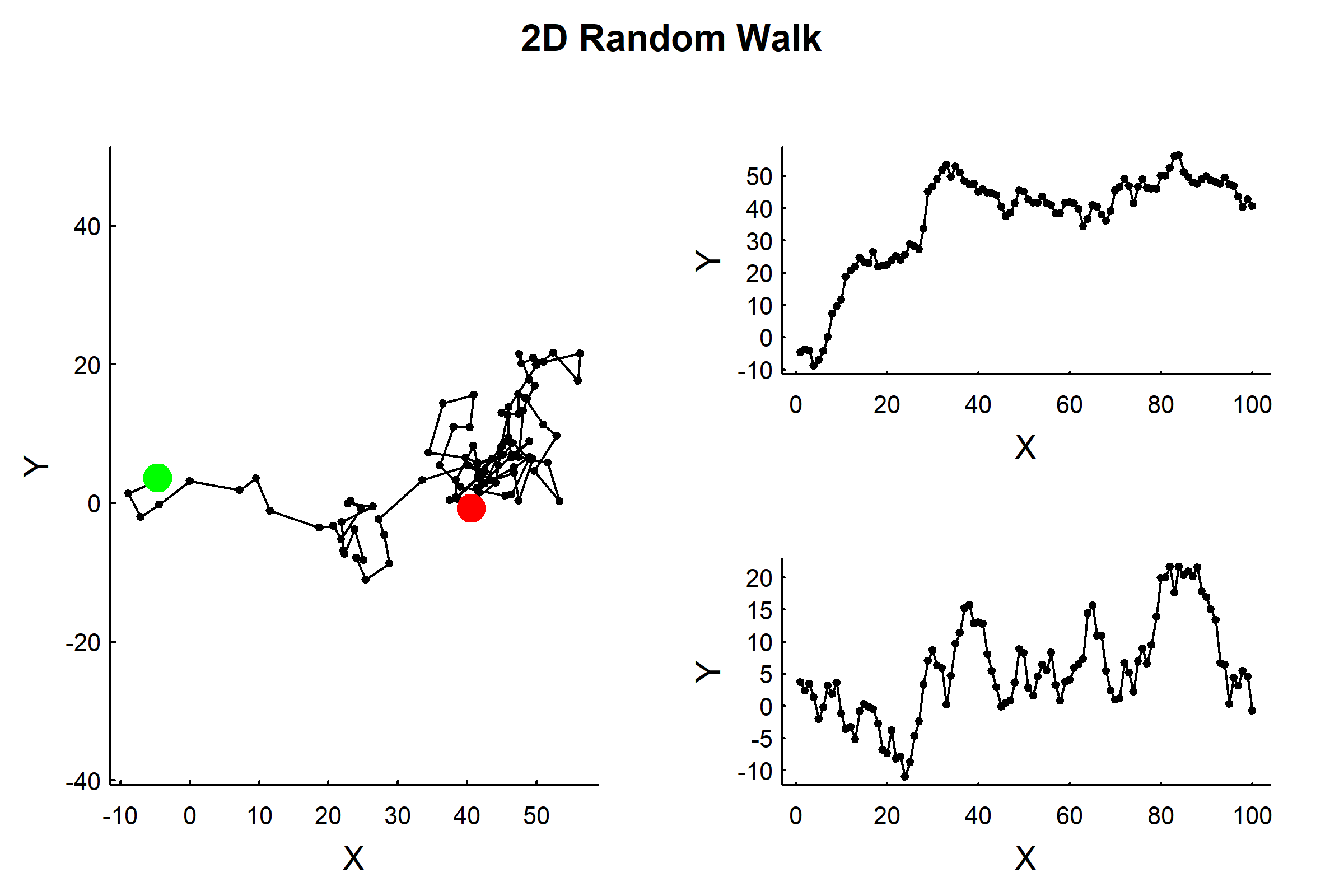 Note that notationally, we will use \(X_t\) as representing one-dimensional movement. The use of the subscript \(t\) is a clear indication that we are indexing out process in time, there is an implicit understanding that \(t \in \{0, 1, 2, 3\}\). For two-dimensional movement we will use \(\bf Z_t\), a vector containing two dimensions in \(X_t\) and \(Y_t\), or, more conveniently for many computations, as a complex number \(X_t + iY_t\).