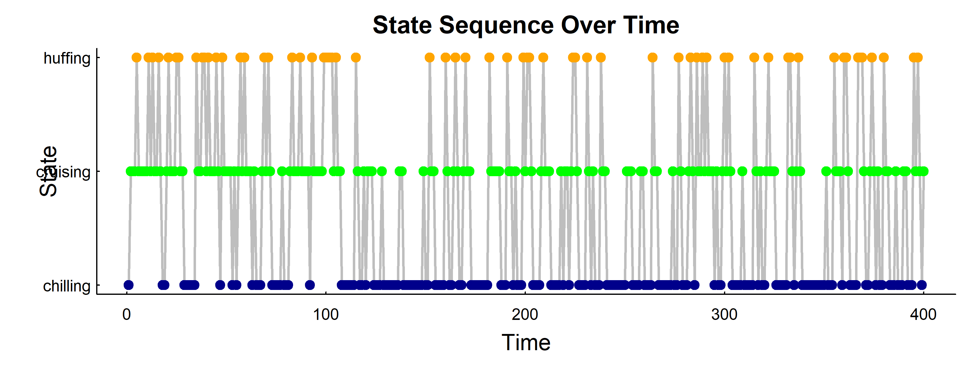 # Movement parameters for each state# State 1 (chilling): no persistence, small steps# State 2 (cruising): medium persistence, medium steps # State 3 (huffing): high persistence, large stepsrhos<-c(0, 0.5, 0.9)# turning angle concentrationalphas<-c(1, 2, 5)# Weibull shape for step lengthbetas<-c(0.5, 3, 8)# Weibull scale for step length# Helper function for wrapped Cauchyrwc<-function(n, mu, rho){ifelse(rho==0, runif(length(rho==0), 0, 2*pi), rcauchy(n, mu, -log(rho))%%(2*pi))}# Simulate turning angles based on statethetas<-rwc(n, mu =0, rho =rhos[State_mc])# Simulate step lengths based on statestep_lengths<-rweibull(n, shape =alphas[State_mc], scale =betas[State_mc])# Create movement pathS<-complex(arg =cumsum(thetas), modulus =step_lengths)Z<-cumsum(S)