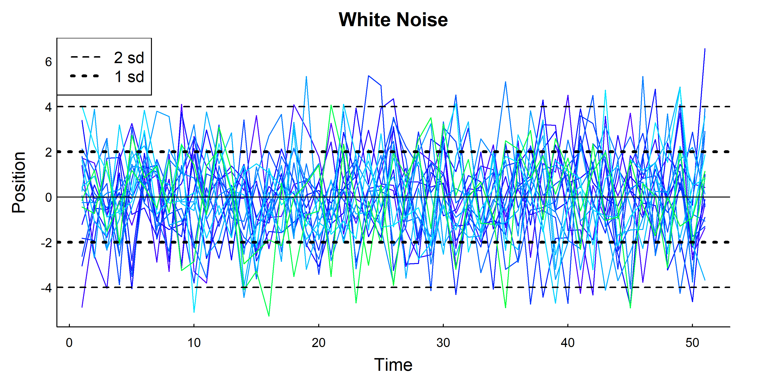 i<-1:20; n<-50X<-sapply(i, function(x)rnorm(n+1, sd =sigma))matplot(X, type ="l", lty =1, col =topo.colors(n), xlab ="Time", ylab ="Position", main ="White Noise")abline(h =c(-2*sigma, -sigma, 0, sigma, 2*sigma), lty =c(2,3,1,3,2), col ="black", lwd =c(1.5,3,1,3,1.5))legend("topleft", lwd =c(1.5,3), lty =c(2,3), legend =c("2 sd", "1 sd"))