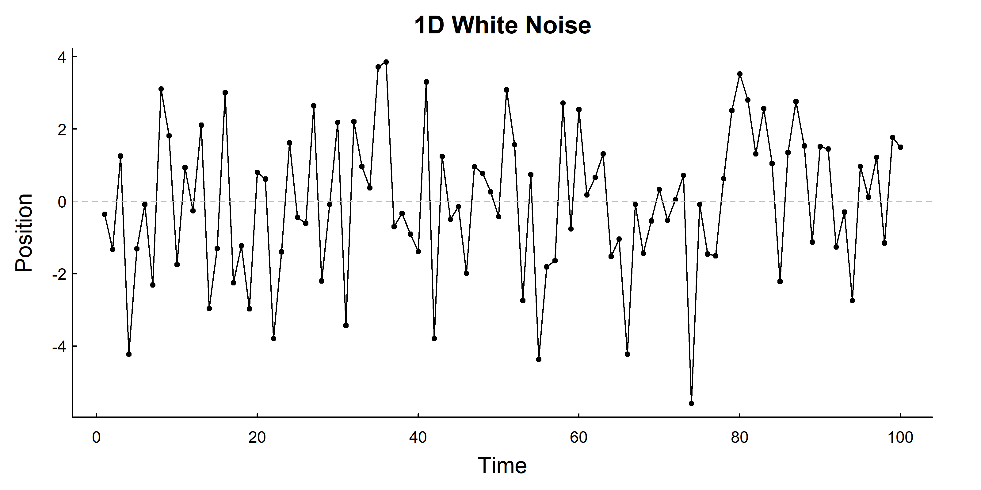 # Parameterssigma<-2n<-100# Simulate 1D white noiseX<-sigma*rnorm(n)# Visualizeplot(1:length(X), X, type ="o", xlab ="Time", ylab ="Position", main ="1D White Noise", pch =19, cex =0.5)abline(h =0, lty =2, col ="grey")