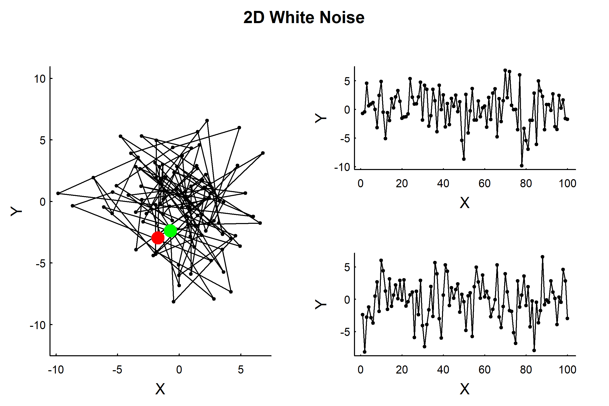 # Parameterssigma<-3n<-100# Simulate 2D white noise using complex numbersZ<-rnorm(n, sd =sigma)+1i*rnorm(n, sd =sigma)# Visualizescantrack(Z)title("2D White Noise", outer =TRUE)