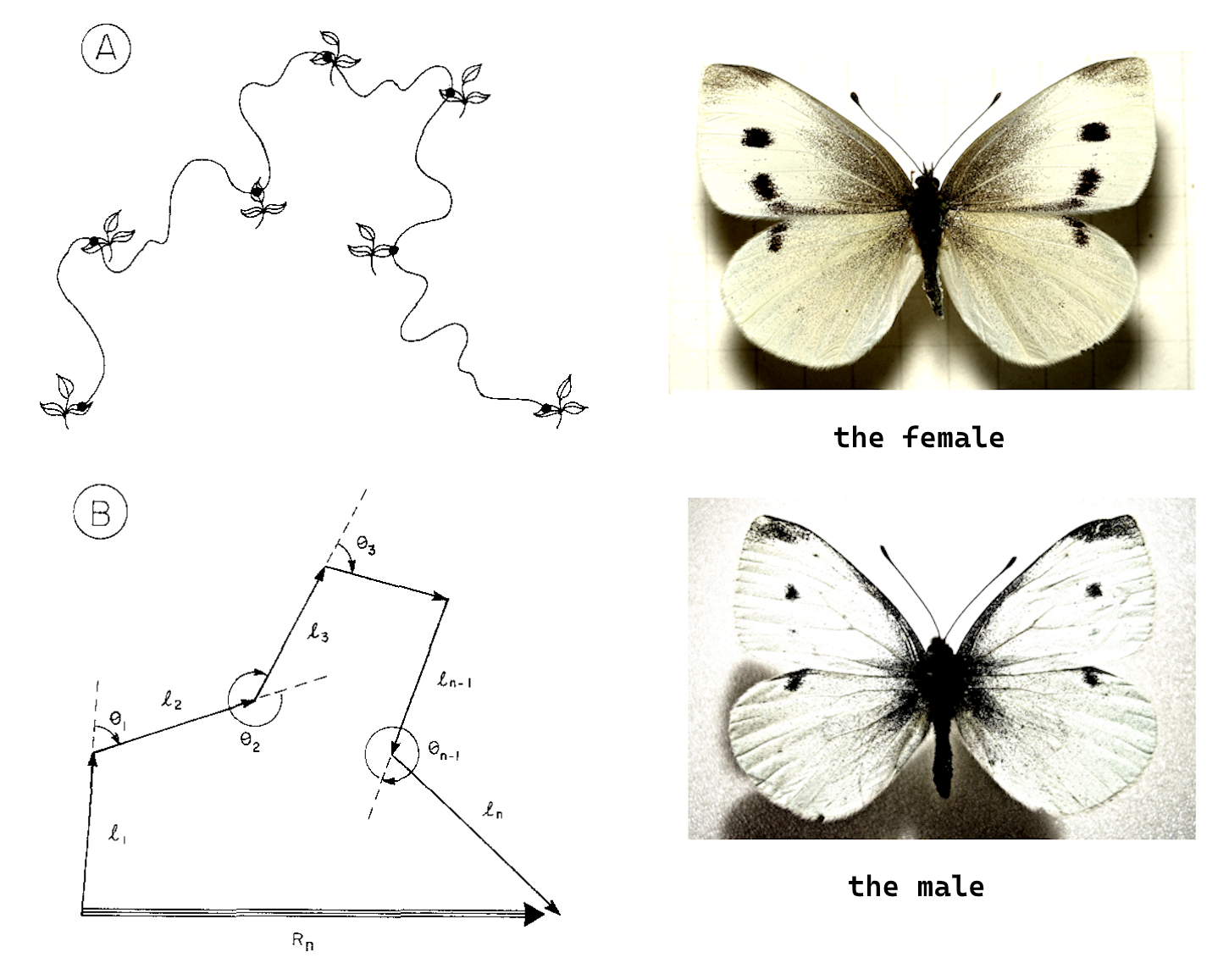 Figure 12.1: The queen of discrete movement models, the Correlated Random Walk, sketched lovingly at left from Kareiva and Shigesada (1983), based on no less lovingly following Pieris rapae - the cabbage white butterfly (at right) - flitting from flower to flower.